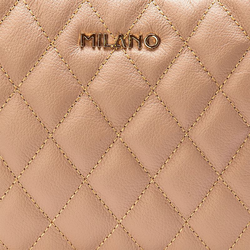 Bolsa Tiracolo ou Transversal Feita em Couro Pequena com Matelassê e Detalhe em Corrente na Alça, na cor nude. Com formato retangular com cantos arredondados em tamanho pequeno, frente e traseira com acabamento em matelassê soft (acolchoado), marca Milano aplicada em letreiro metálico na cor Preto, laterais no mesmo couro em acabamento liso, fechamento na parte superior em zíper com puxador no mesmo couro da bolsa, alça tiracolo ou transversal fixada nas laterais da abertura por passador em couro, alça composta de duas partes em corrente acompanhando o tom dos metais, e apoio de ombro também em couro com regulagem e ajuste de altura. O interior é forrado em tecido na cor nude e não possui bolsos ou divisórias internas .