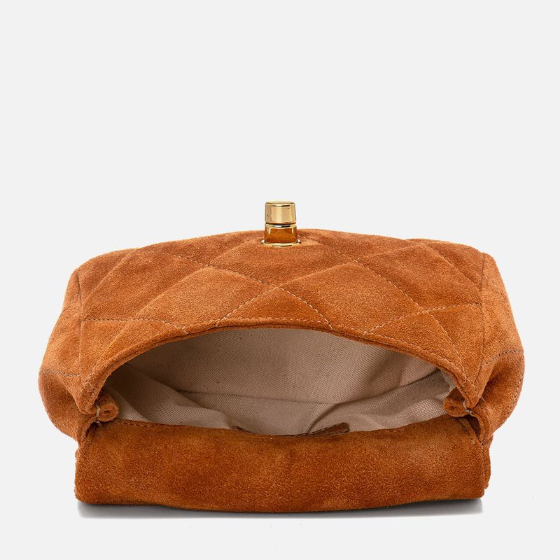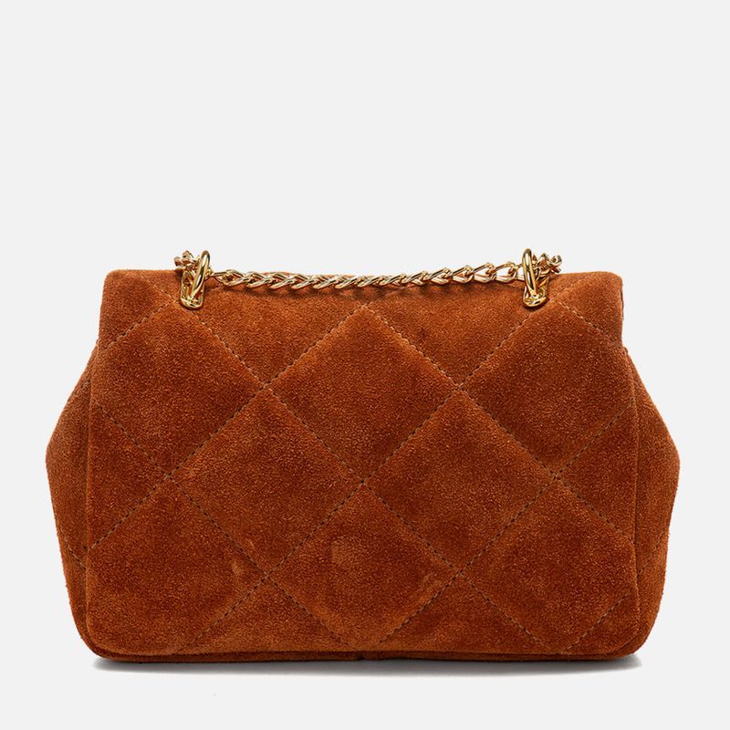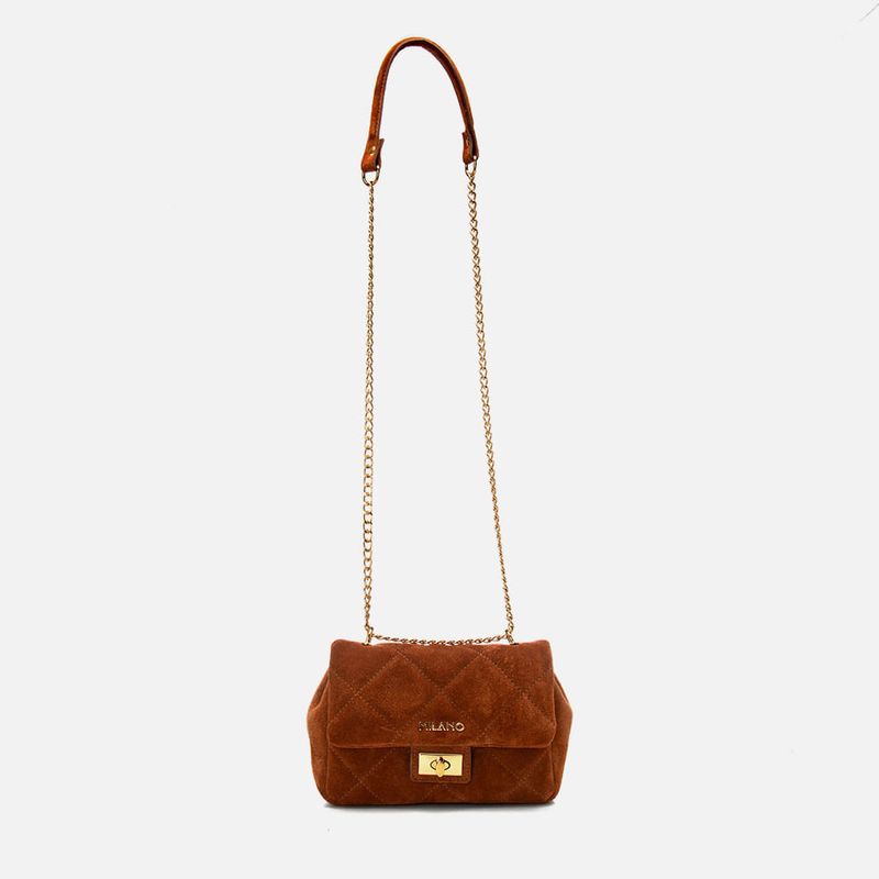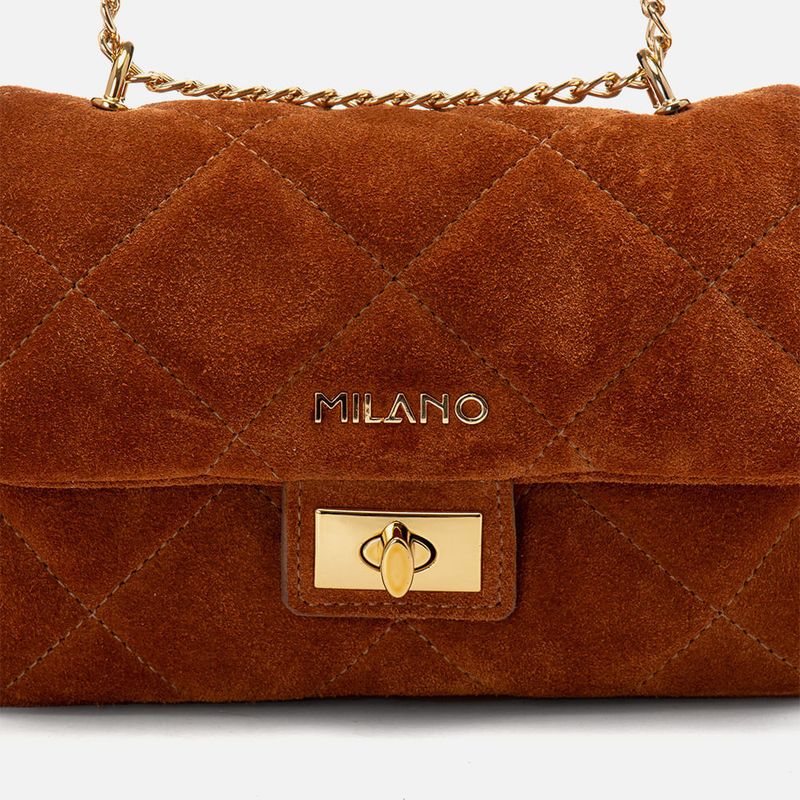 Bolsa Feita em Couro Camurça Tiracolo Pequena em com Matelassê com Alça em Corrente de Metal Dourado com Regulagem de Altura na cor Marrom Camel. Com formato retangular com cantos da base arredondados, tamanho pequeno, detalhe em matelassê em todo o revestimento da bolsa – frente e verso, possui aba frontal com fechamento por botão giratório e metal na cor dourado – este metal é fixado em uma pequena tira acoplada a aba, que possui ainda a marca Milano aplicada em letreiro em metal seguindo os tons da bag, na parte superior são aplicados dois ilhós onde vai a alça feita em corrente de metal com apoio de ombro em couro camurça no mesmo tom da bolsa, a alça possui ajuste e regulagem de altura podendo ser usada no ombro ou à tiracolo ou transversal. O interior é forrado em tecido no mesmo tom da bolsa e não possui bolsos ou divisórias, na face traseira vai aplicada uma tag em couro com a marca Milano aplicada em silk na cor dourada.
