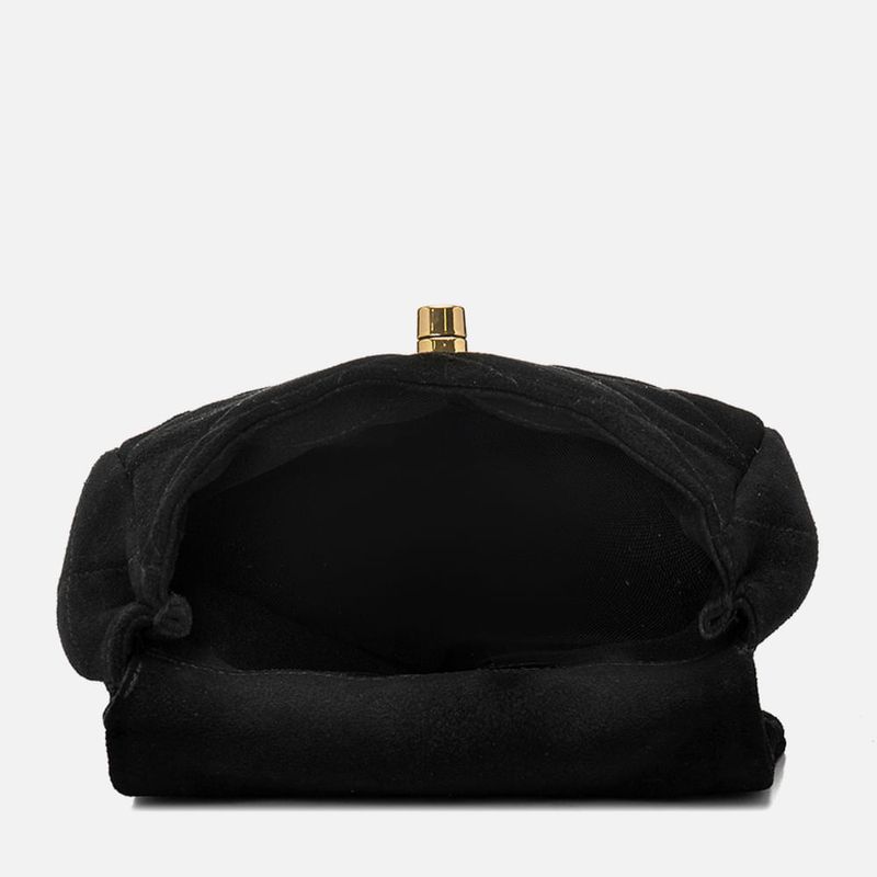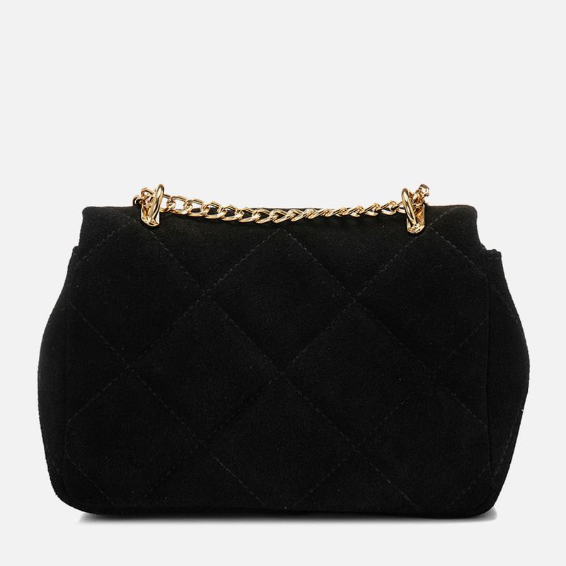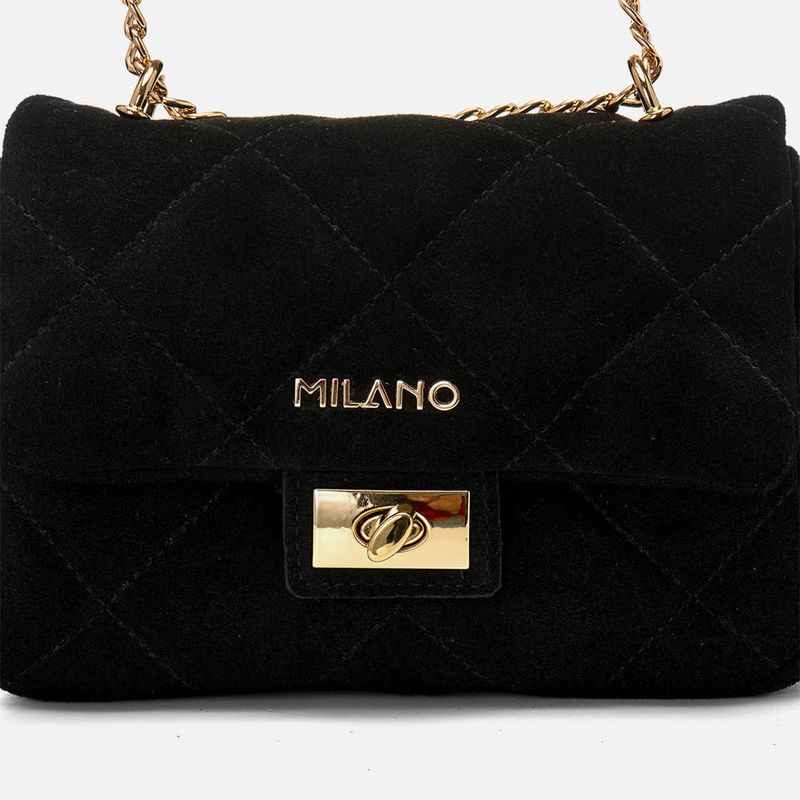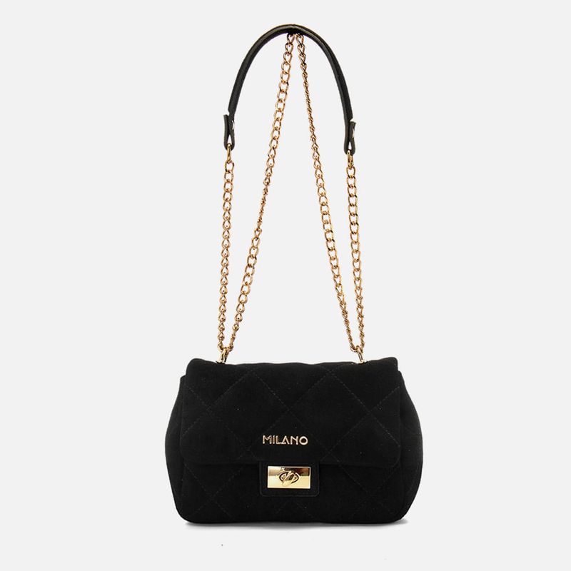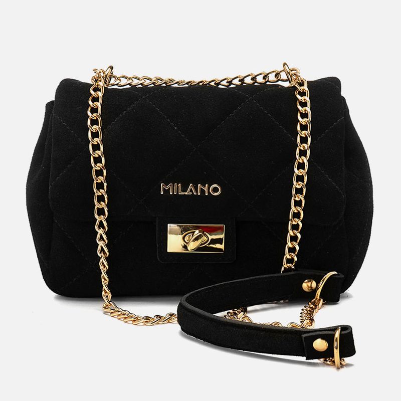 Bolsa Feita em Couro Camurça Tiracolo Pequena em com Matelassê com Alça em Corrente de Metal Dourado com Regulagem de Altura na cor Preto. Com formato retangular com cantos da base arredondados, tamanho pequeno, detalhe em matelassê em todo o revestimento da bolsa – frente e verso, possui aba frontal com fechamento por botão giratório e metal na cor dourado – este metal é fixado em uma pequena tira acoplada a aba, que possui ainda a marca Milano aplicada em letreiro em metal seguindo os tons da bag, na parte superior são aplicados dois ilhós onde vai a alça feita em corrente de metal com apoio de ombro em couro camurça no mesmo tom da bolsa, a alça possui ajuste e regulagem de altura podendo ser usada no ombro ou à tiracolo ou transversal. O interior é forrado em tecido no mesmo tom da bolsa e não possui bolsos ou divisórias, na face traseira vai aplicada uma tag em couro com a marca Milano aplicada em silk na cor dourada.