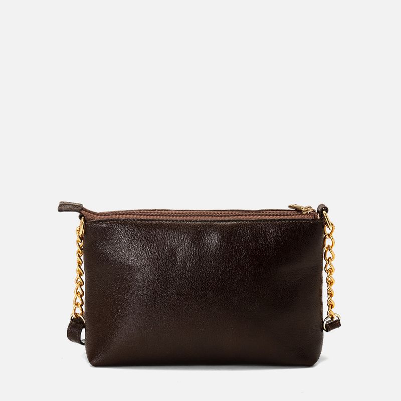 Bolsa Pequena Tiracolo ou Transversal Feita em Couro com Bolso Externo com Zíper na cor Marrom Pinhão. Com formato retangular sem fole lateral e tamanho pequeno, esta bolsa é super prática para o dia a dia, feita em couro legítimo possui letreiro metálico na cor dourada aplicada próximo à boca do bolso externo frontal, que tem detalhe em costura pesponto na frente e fechamento em zíper com puxador em metal na cor dourada. Na parte superior tem dois elos quadrados fixados nas laterais para alça feita em parte de corrente grande dourada e no mesmo couro, em tira média achatada com regulagem de altura, esta alça é fixa. Possui fechamento em zíper e a parte interna é forrada em tecido na cor nude e tem ainda um bolso interno na face traseira com fechamento em zíper no mesmo tom da bolsa.