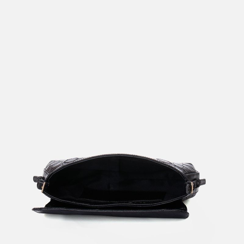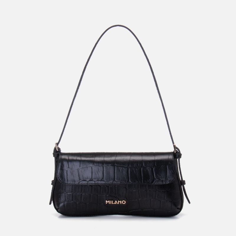 Bolsa Baguete de Mão ou Ombro Feita em Couro Textura Animal Print Croco Estruturada e Texturizada com na cor Preto. Com formato retangular tipo trapézio pequena com cantos inferiores arredondados, feita 100% em couro legítimo estruturado e texturizado em animal print tipo croco, face frontal com aba de fechamento acompanhando o formato da bolsa, possui ainda a logo Milano aplicada em letreiro em metal na cor dourada aplicado na parte inferior frontal da bolsa, o fechamento é feito por 2 botões magnéticos embutidos na parte interna do couro, na lateral do fole da bolsa vão aplicadas as alças que são fixadas por passador em couro com fivela em metal quadrado dourado que permite a regulagem de altura da mesma, possui ainda um passador para fixar a ponta da alça deixando a bolsa mais estética. O interior é forrado em tecido na cor nude e possui um bolso aberto pequeno na face traseira.