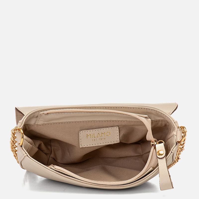 Bolsa Hobo ou Meia Lua Pequena Feita em Couro com Textura Animal Print em Croco Aba Frontal e Alça com Detalhe em Corrente na cor Off White e Vanilla. Com formato meia lua pequena, essa bag é feita 100% em couro legítimo – a aba é feita em couro com textura animal print de croco e a base e corpo da bolsa em couro liso no mesmo tom, possui aba frontal de fechamento (feito através de botão magnético) que recobre toda a frente da bolsa – sendo ainda fechada com zíper, possui ainda na aba a logo Milano em letreiro metálico na cor dourada, a alça é fixada na lateral por dois elos, feita no mesmo couro da bolsa com detalhe em corrente em metal dourado, possui regulagem de altura através de fivela e passadores e ainda detalhe em correntes seguindo o tom dos metais. O interior é forrado em tecido no mesmo tom da bolsa, não possui bolsos ou divisórias e possui ainda um aplique em couro com a marca Milano e o carimbo EST. 1974 feito em silk na cor dourado.