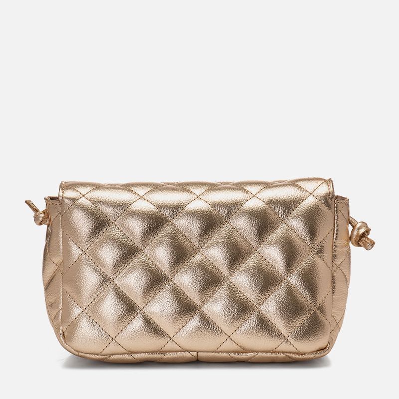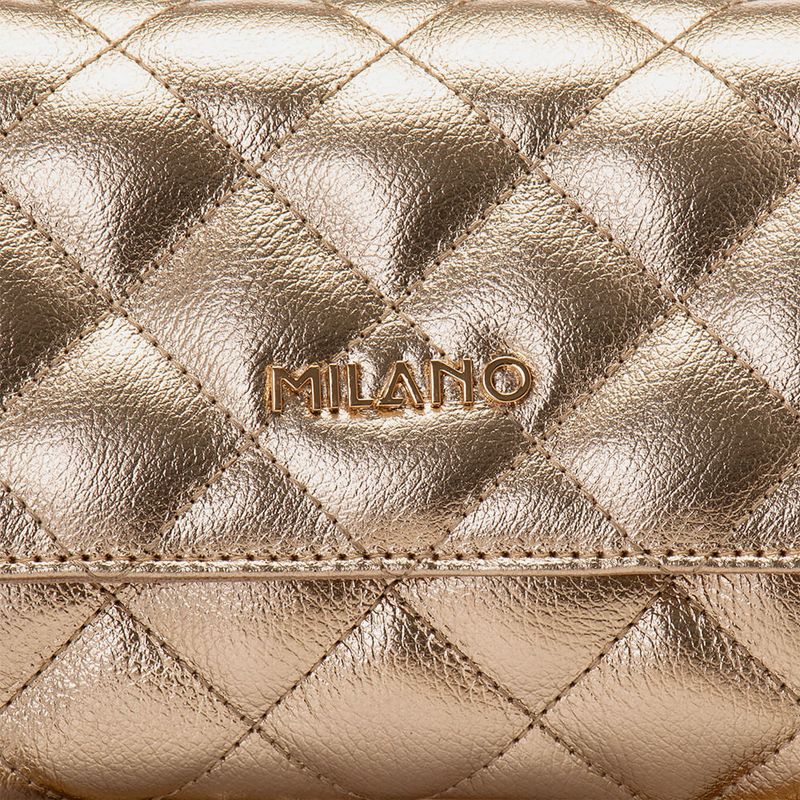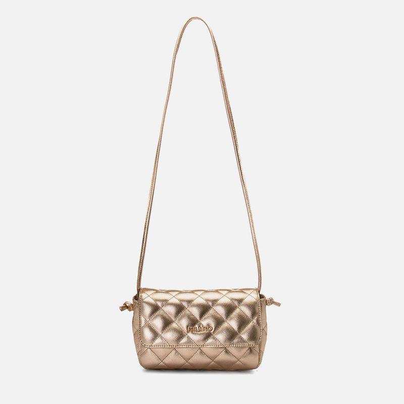 Bolsa Tiracolo ou Transversal Pequena Feita em Couro com Aba Frontal e Acabamento Total em Matelassê Metalizado na cor Ouro Light. Com tamanho pequeno e formato retangular, possui aba frontal com fechamento por botão de pressão em metal no mesmo tom da bag – nela vai aplicada um letreiro em metal com a marca Milano, possui ainda acabamento total em matelassê que reveste toda a bolsa – frontal, traseira, laterais e aba. As alças são feitas no mesmo couro da bolsa, fininho e arredondado, fixado nas laterais da bolsa através de 2 ilhos com acabamento na ponta em nozinho, deixando o modelo jovem e descolado. O interior da bolsa é forrado em tecido em sobretom à peça e não possui bolsos ou divisórias internas.