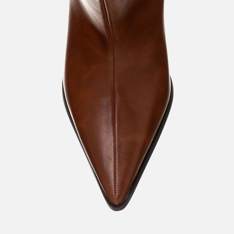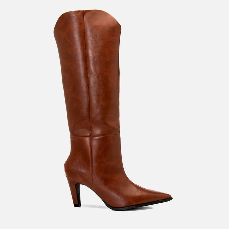 Bota Cano Alto com Salto Médio Fino e Bico Fino na cor Marrom. Com solado emborrachado na cor preta sob o salto e parte frontal da palmilha deixando a vira aparente, salto médio fino, cabedal com traseira arredondado e bico fino com recortes nas laterais do cano, feita em napa na cor café com cano alto, possui decote com recorte em V na parte frontal e traseira do cano. O interior é revestido em tecido na cor preta e a palmilha é macia e tem a marca Milano aplicada em etiqueta 3D na cor dourada.