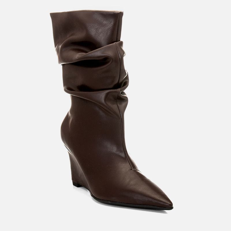 Bota Cano Médio Slouchy Enrugado com Salto Anabela e Bico Fino na cor Café. Com solado emborrachado na cor preta com saltinho mínimo, salto anabela alto, cabedal com traseira arredondado e bico fino, feita em napa na cor café com cano médio tipo slouchy, tendência fashion de acabamento com design propositalmente mais soltinho e levemente franzido, que cria um visual moderno e despojado na bota, interior revestido em tecido na cor preta. A palmilha é macia e tem a marca Milano aplicada em etiqueta 3D na cor dourada.