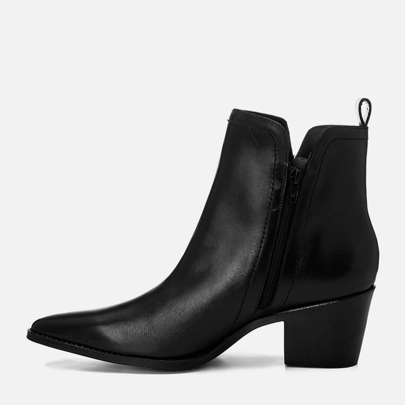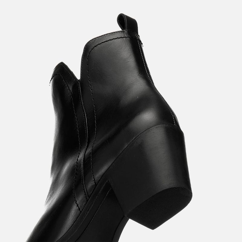 Bota em Couro Cano Baixo Recorte em V Salto Médio Bloco Bico Fino na cor Preto. Com solado emborrachado na cor preta, com salto médio bloco estilo western embutido, a parte frontal do salto é oversize deixando a vira aparente com detalhe em costura pesponto nas bordas, cabedal feito em couro legítimo com traseira arredondada e bico fino, possui recortes nas laterais do tornozelo também com detalhe em costura pesponto, o cano é médio e tem detalhe em decote V nas laterais, possui ainda um puxador na traseira feito do mesmo couro e zíper na parte interna do pé para facilitar o calce. O interior é forrado em tecido na cor café e tem palmilha macia com a marca Milano aplicada em etiqueta 3D na cor dourada.