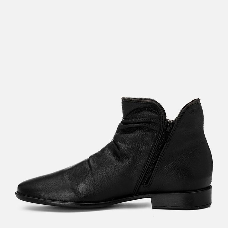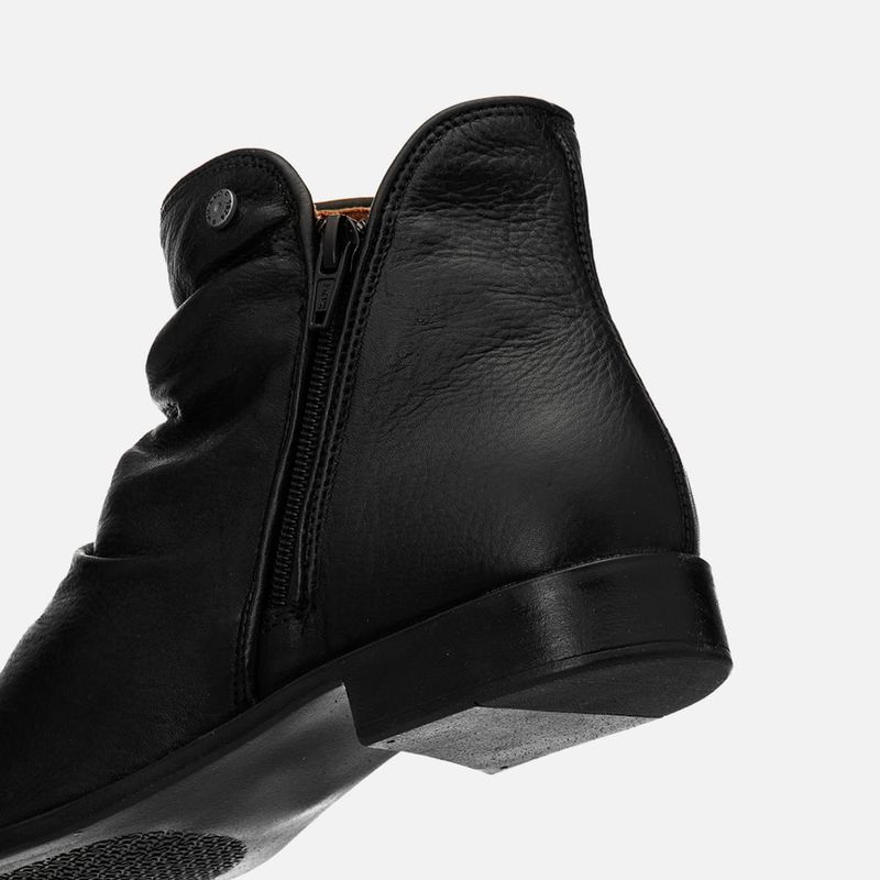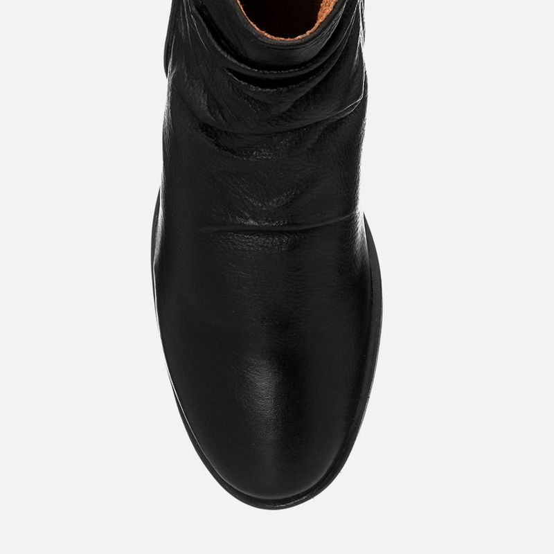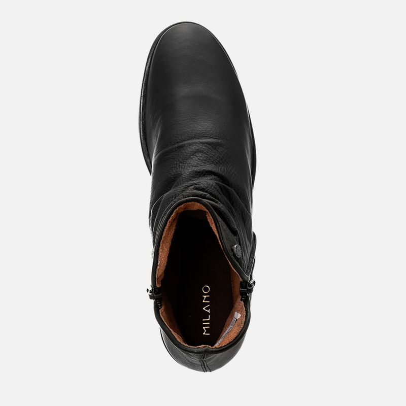 Bota Feita em Couro com Cano Enrugado e Detalhe em Zíper no cano na cor Preto. Com solado rasteiro emborrachado com formato anatômico com salto baixo embutido na cor café, cabedal com acabamento na parte frontal enrugado (tipo slouchy) e formato arredondado – bico e traseira, recorte na lateral do tornozelo com acabamento em costura pesponto dupla no mesmo tom do produto, possui detalhe em zíper decorativo tratorado com puxador no mesmo couro do produto e metais na cor marrom, possui metal tipo botão redondo na cor prata com a marca Milano aplicado no cano e zíper na parte interna do pé para facilitar o calce. A palmilha é macia e tem a marca Milano aplicada em etiqueta 3D na cor dourada.