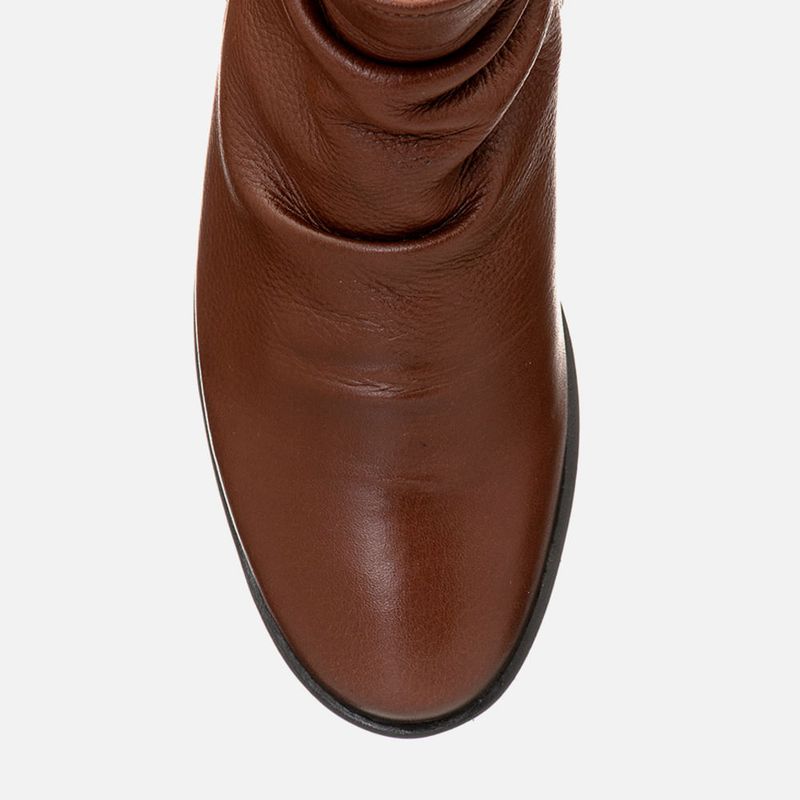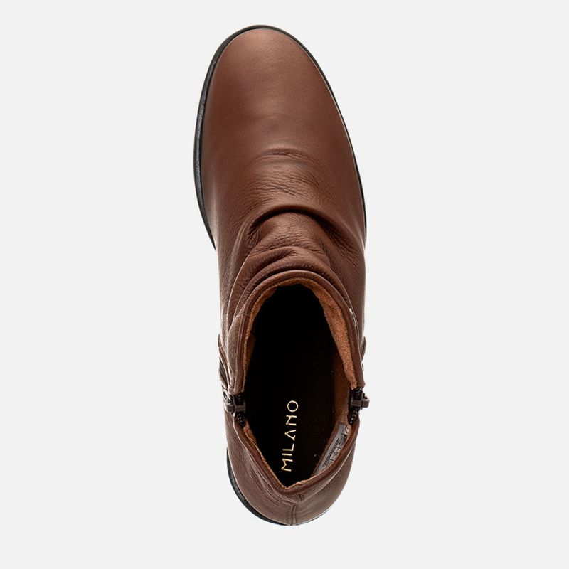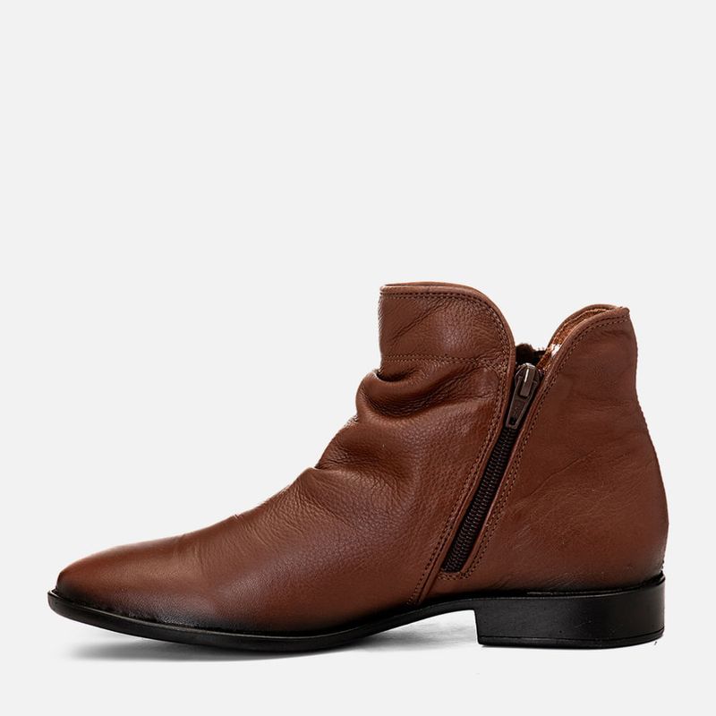 Bota Feita em Couro com Cano Enrugado e Detalhe em Zíper no cano na cor Terracota. Com solado rasteiro emborrachado com formato anatômico com salto baixo embutido na cor café, cabedal com acabamento na parte frontal enrugado (tipo slouchy) e formato arredondado – bico e traseira, recorte na lateral do tornozelo com acabamento em costura pesponto dupla no mesmo tom do produto, possui detalhe em zíper decorativo tratorado com puxador no mesmo couro do produto e metais na cor marrom, possui metal tipo botão redondo na cor prata com a marca Milano aplicado no cano e zíper na parte interna do pé para facilitar o calce. A palmilha é macia e tem a marca Milano aplicada em etiqueta 3D na cor dourada.