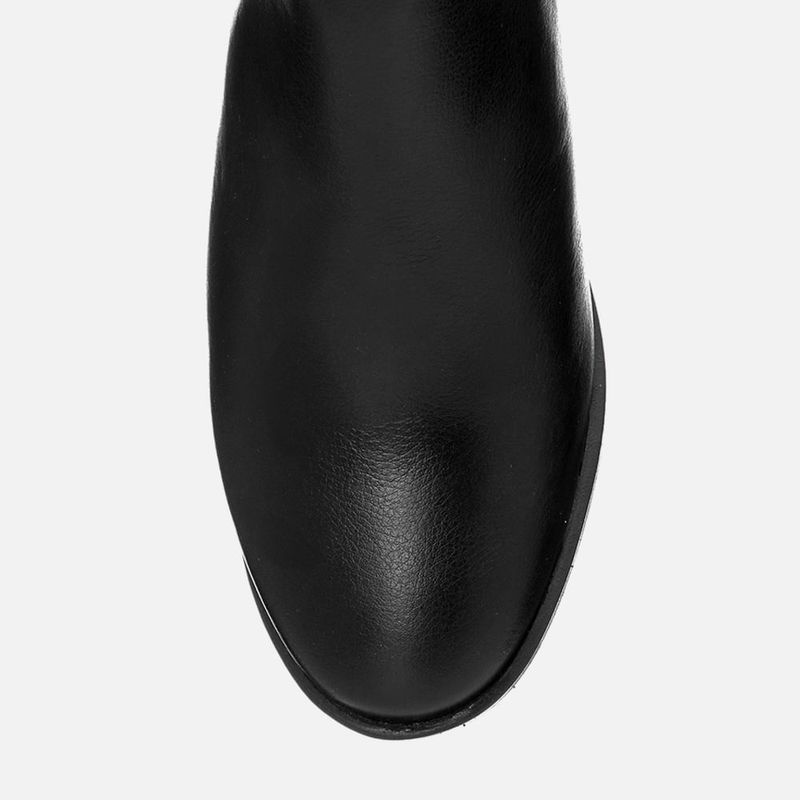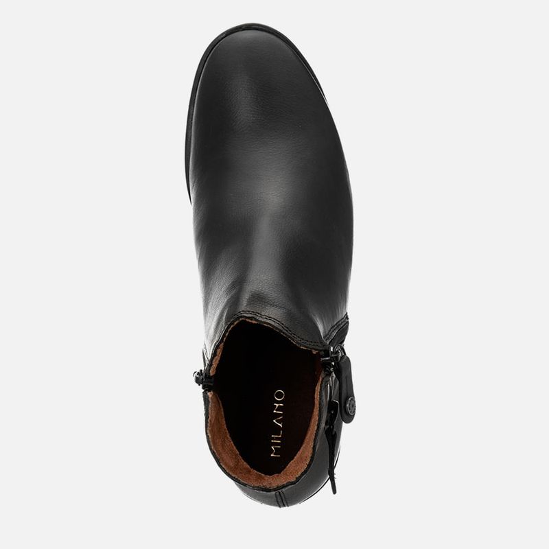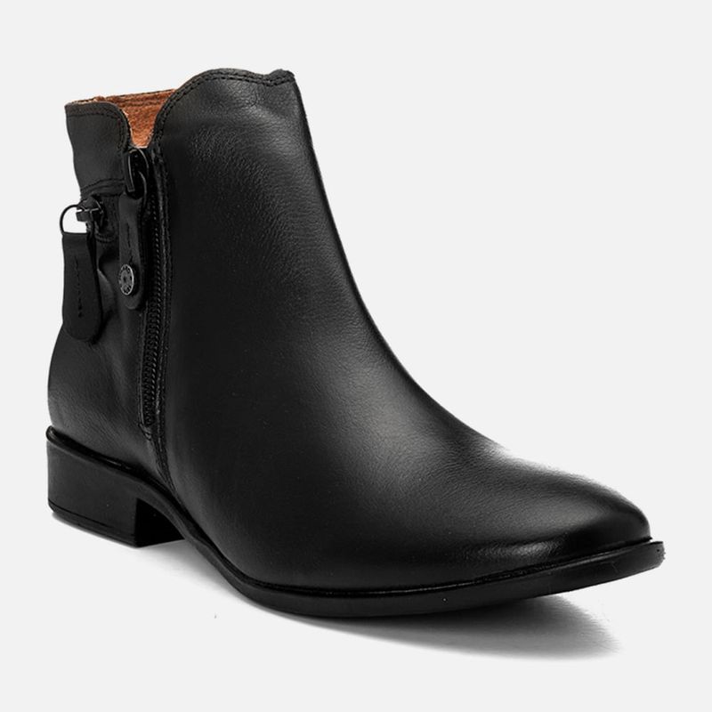 Bota Feita em Couro com Detalhe em Zíper nas Laterais e Traseiras na cor Preto. Com solado rasteiro preto emborrachado com formato anatômico com salto baixo embutido na cor preto, cabedal feito em couro legítimo com formato arredondado – bico e traseira, recorte na lateral do tornozelo com acabamento em costura pesponto dupla no mesmo tom do produto, possui detalhe em zíper decorativo com puxador no mesmo couro do produto e aplicação em metal tipo botão redondo na cor prata com a marca Milano aplicado no puxador do zíper, possui ainda um zíper decorativo na parte traseira e outro na parte interna do pé para facilitar o calce. A palmilha é macia e tem a marca Milano aplicada em etiqueta 3D na cor dourada.