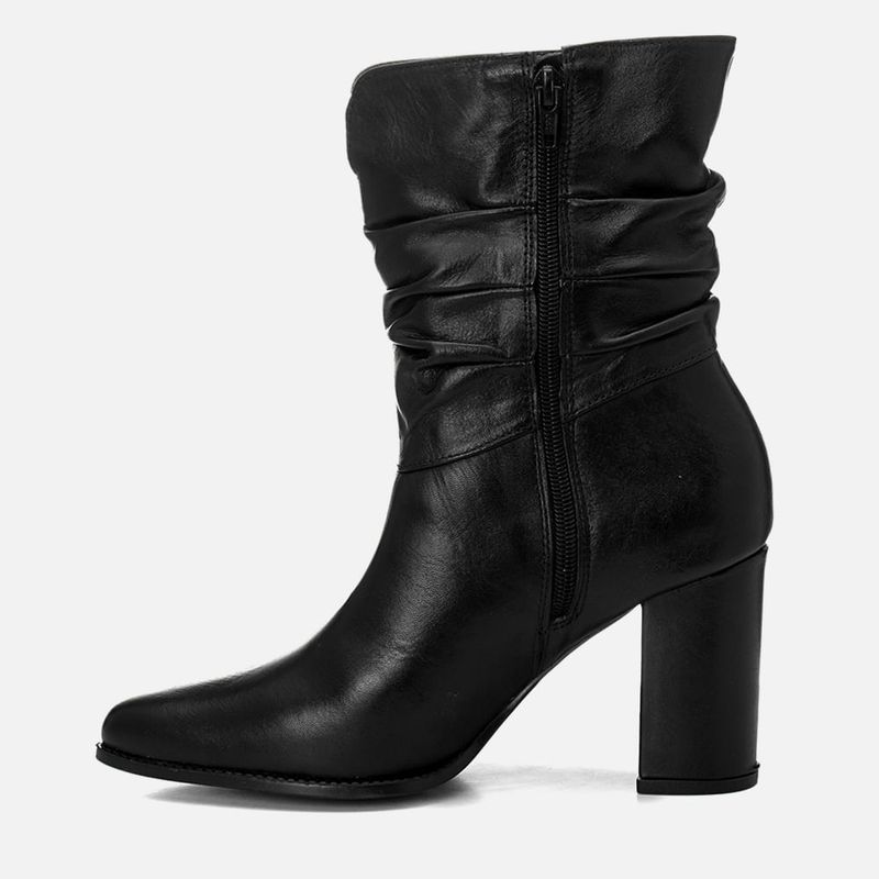 Bota Feita em Couro com Cano Médio Slouchy Enrugado com Salto Bloco Alto e Bico Fino na cor Preto. Com solado emborrachado na cor preta sob o salto e parte frontal da palmilha com vira aparente, salto alto bloco revestido, cabedal com traseira arredondado e bico fino, feita em couro legítimo com cano médio tipo slouchy, tendência fashion de acabamento com design propositalmente mais soltinho e levemente franzido, que cria um visual moderno e despojado na bota, possui recortes nas laterais do cano e tornozelo, o cano tem detalhe em recorte em V na parte frontal e zíper total na parte interna do pé para facilitar o calce. O interior revestido em tecido na cor preta. A palmilha é macia e tem a marca Milano aplicada em etiqueta 3D na cor dourada.