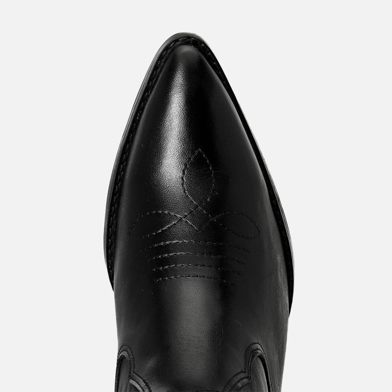 Bota Western Feita em Mix de Couros Cano Médio Salto Bloco Médio Bico Fino Bordado e Aplicação Metal Tachas Rebites Zíper Interno na cor Preto. Com emborrachado na cor preta costurado ao cabedal, salto médio bloco com textura amadeirada, cabedal feito em mix de couro legítimo sendo um couro liso e outro com textura animal print de cobra, ambos no mesmo tom, o modelo tem o corpo da bota encaixado com vira aparente, traseira arredondada e bico fino, feita com recortes no tornozelo e lateral do cano, onde o recorte deixa à vista o detalhe com o couro texturizado e tem aplicações seguindo o desenho do detalhe em metal tipo rebite pequeno na cor dourada, o acabamento é feito em costura pesponto, cano médio abaixo do joelho com recorte da boca em formato meia lua, possui bordados no bico característico do estilo Western e contornando os recortes feito em sobretom a cor da bota. Na abertura do cano possui dois puxadores costurados feitos no mesmo couro do modelo e zíper na parte interna para facilitar o calce. A palmilha é macia e tem a marca Milano aplicada em etiqueta 3D na cor dourada.