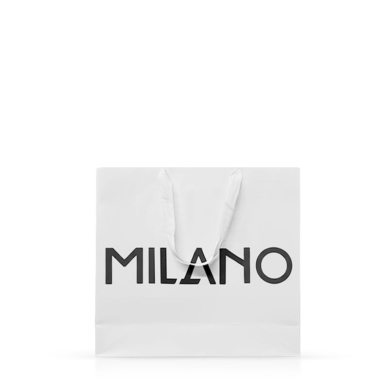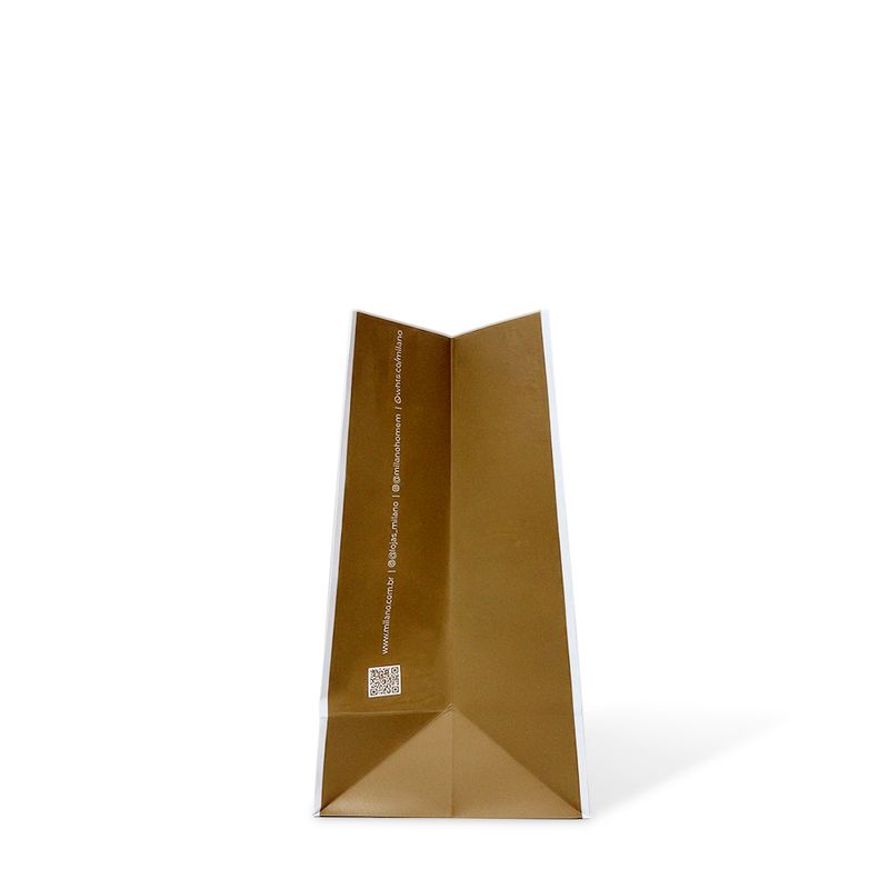 Com formato retangular, tem tamanho médio em papel OffSet, com alça em gorgurão branca, face frontal e verso totalmente brancos com o logo MILANO em preto, e fole lateral em dourado. Possui 34 cm de largura, 30 cm de altura e 14 cm de profundidade, sendo ideal para acomodar até duas caixas pequenas femininas (tipo rasteira ou sapatilhas) ou uma caixa média.