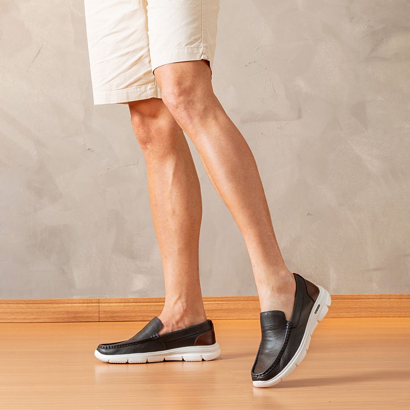 Mocassim masculino de estilo clássico e elegante. Feito com couro bovino floater para durabilidade e sofisticação. Possui solado em E.V.A, proporcionando leveza e conforto ao caminhar. Sua palmilha é de couro, garantindo conforto e respirabilidade. A calcanheira de P.U forrada em couro oferece suporte adicional. Detalhe: solado extremamente leve para uma experiência confortável durante todo o dia.