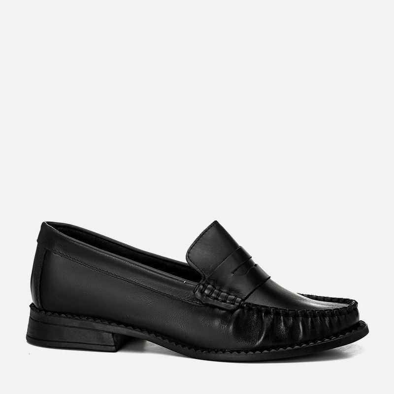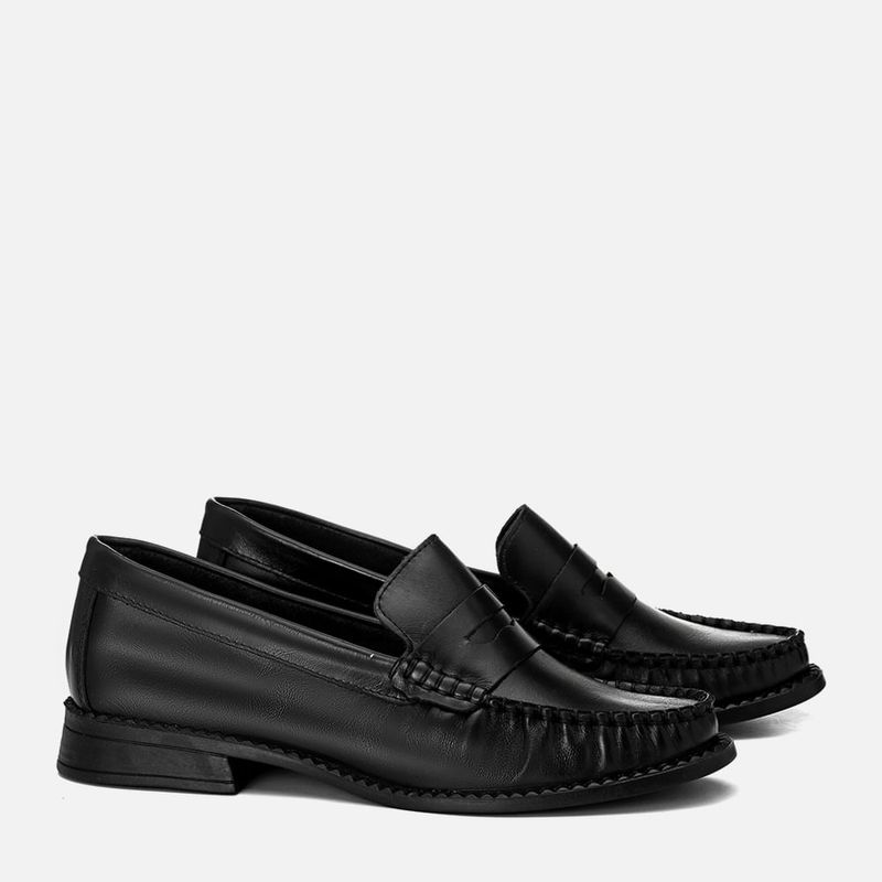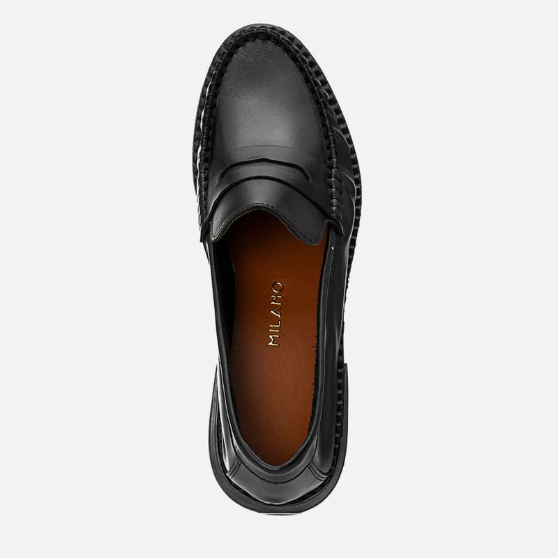 Mocassim Feito em Couro Legítimo com Cabedal Clássico com Costura Pesponto Aparente e Gravata Loafer com Salto Baixo e Solado com Detalhe em Vira na cor Preto. Com solado emborrachado na cor caramelo com salto baixo em formato trapézio e detalhe tipo vira aparente dentada aparente no encaixe da palmilha. O cabedal tem traseira e bico arredondados, feito em couro liso e tem detalhe em recortes no peito do pé, traseira e contorno do cano, a parte frontal tem acabamento feito à mão em costura pesponto aparente na biqueira – deixando um visual bem marcado e clássico do modelo. O decote no peito do pé é quadrado e tem uma tira loafer em detalhe com vazado na parte central e fixo nas laterais na mesma costura do bico, as laterais do cano e traseira são feitas em peças recortadas. O interior não tem forração, pois é feito na parte interna do couro que dá mais respirabilidade e palmilha também é forrada em couro com a marca Milano aplicada em etiqueta 3D.