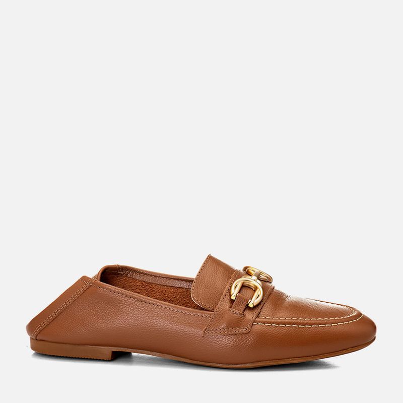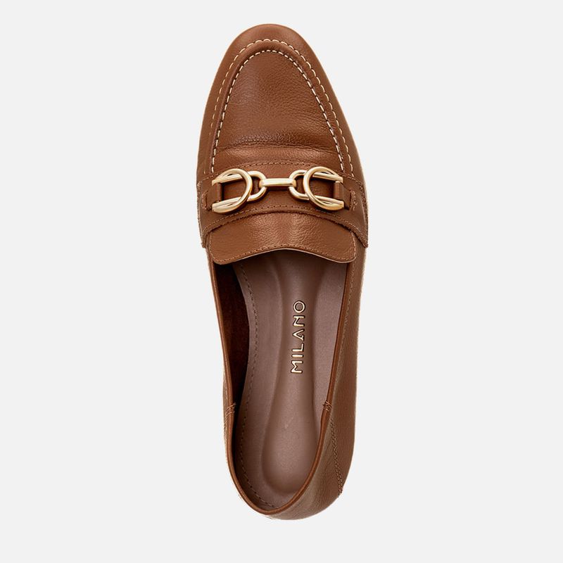 Mocassim Loafer Feito em Couro 2 em 1 Uso Mule com Metal Bridão Dourado na cor Caramelo. Com solado emborrachado na cor caramelo com saltinho mínimo, cabedal feito em couro legítimo com traseira e bico arredondados, costura aparente no peito do pé clássico do modelo, decote quadrado no peito do pé e detalhe em tira loafer com aplicação de peça com formato de fivela, ou bridão, na cor dourado metalizado cromado, o modelo possui ainda a peça traseira com costura que permite o uso também como mule, dobrando a peça para dentro e pisando por cima da traseira, o interior não tem forração deixando a parte interna do couro aparente que permite maior respirabilidade, a palmilha é macia e tem a marca Milano aplicada em etiqueta 3D na cor dourada.