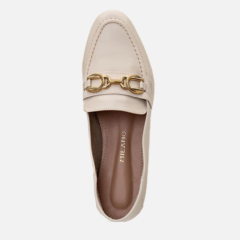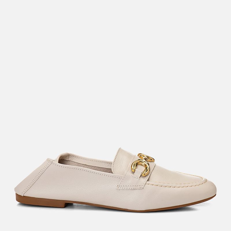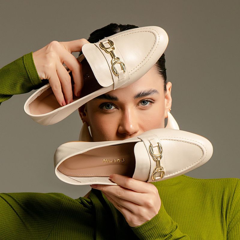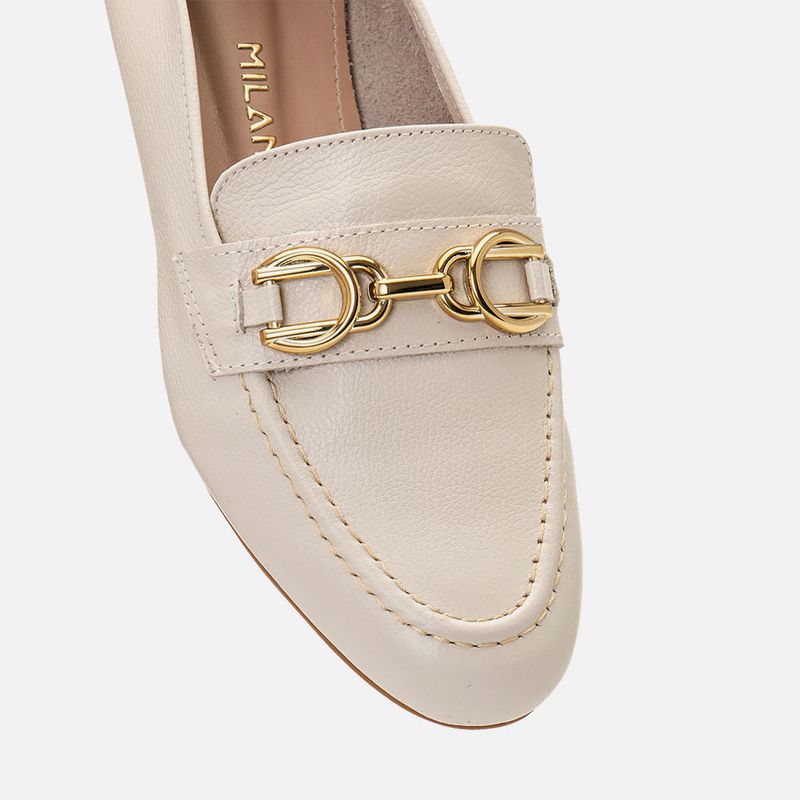 Mocassim Loafer Feito em Couro 2 em 1 Uso Mule com Metal Bridão Dourado na cor Off White. Com solado emborrachado na cor caramelo com saltinho mínimo, cabedal feito em couro legítimo com traseira e bico arredondados, costura aparente no peito do pé clássico do modelo, decote quadrado no peito do pé e detalhe em tira loafer com aplicação de peça com formato de fivela, ou bridão, na cor dourado metalizado cromado, o modelo possui ainda a peça traseira com costura que permite o uso também como mule, dobrando a peça para dentro e pisando por cima da traseira, o interior não tem forração deixando a parte interna do couro aparente que permite maior respirabilidade, a palmilha é macia e tem a marca Milano aplicada em etiqueta 3D na cor dourada.