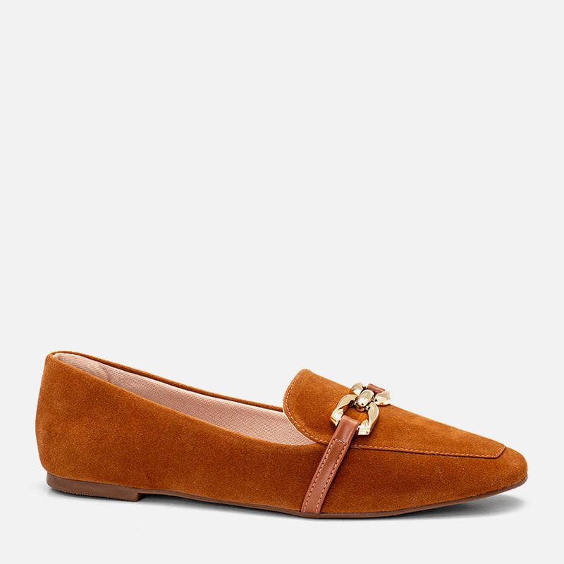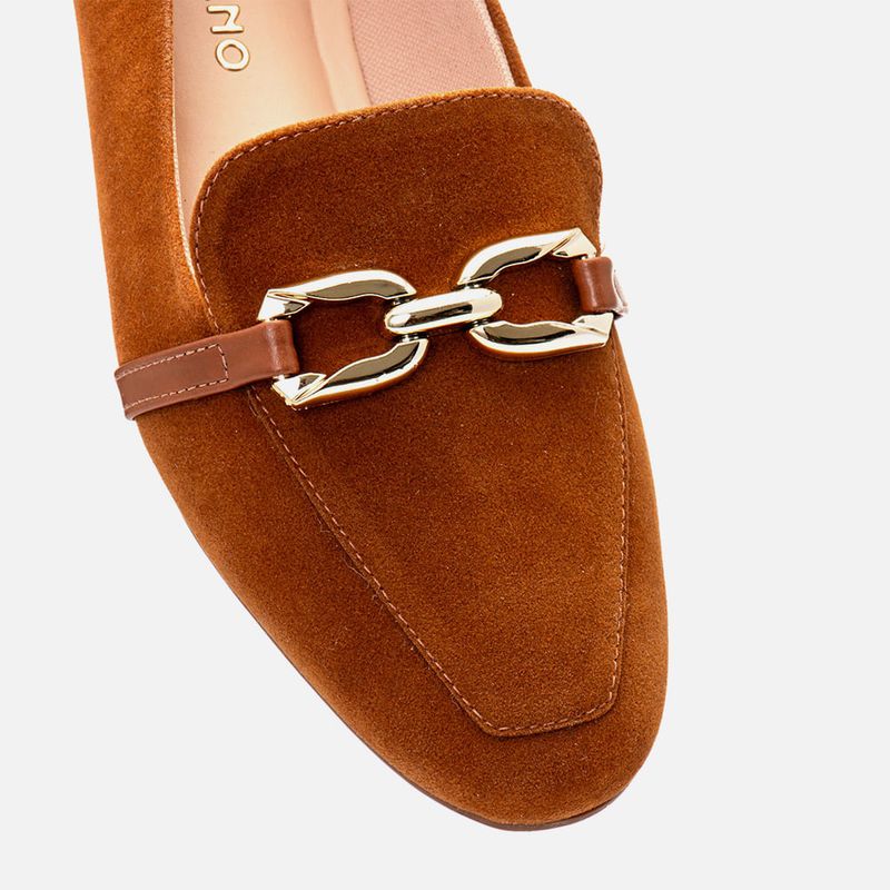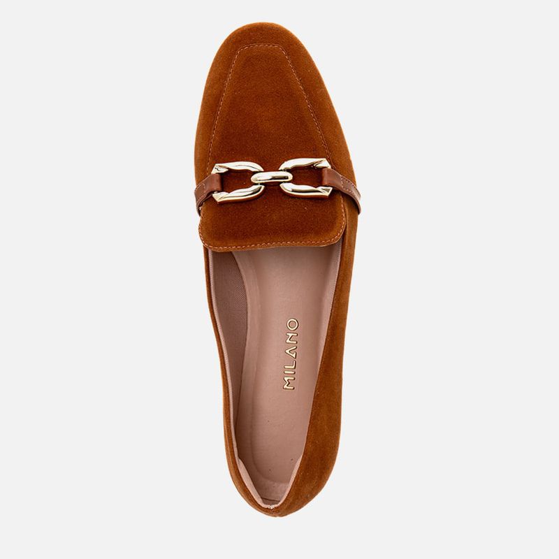 Mocassim Rasteiro com Bico Fino em Material Aveludado tipo Camurça com Detalhe em Fivela Bridão Metalizado Dourado na cor Caramelo. Com solado emborrachado na cor caramelo com saltinho mínimo, cabedal feito em material texturizado e aveludado tipo camurça, com traseira arredondada e bico fino levemente quadrado, recorte no peito do pé clássico do modelo com acabamento em costura pesponto, detalhe em tira em napa no mesmo tom do produto com fivela, ou bridão, metalizado cromado na cor dourada sobre o peito do pé, recorte arredondado nas laterais. O interior é forrado em tecido e tem aplique macio na traseira do calcanhar para maior conforto, a palmilha é macia e revestida também em tecido com a marca Milano aplicada em etiqueta 3D na cor dourada.