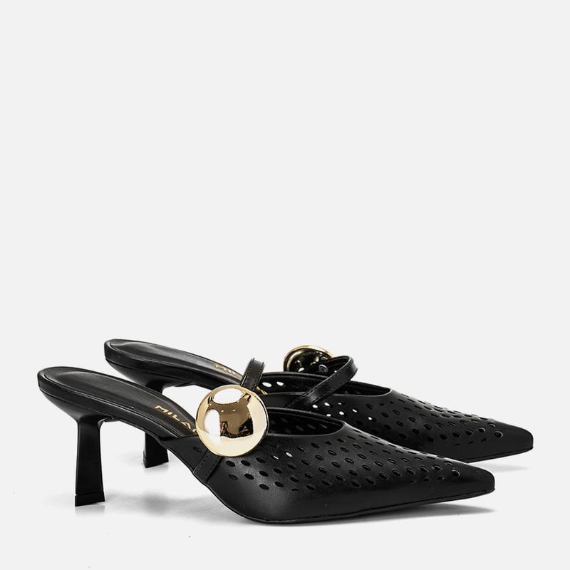 Mule ou Scarpin Aberto com Salto Fino Médio tipo Taça Bico Fino com Aplicação em Peça Redonda Metalizada e Cabedal com Furação Total Feita à Laser na cor Preto. Com solado emborrachado no mesmo tom do produto, salto fino tipo taça com tamanho médio pintado na cor, cabedal aberto com traseira arredondada e bico fino – o modelo tem detalhe em furação total no bico feito por corte à laser deixando pele à mostra e visual sofisticado no estilo boho, o decorte do peito do pé é arredondado cavado e tem uma tira fina achata cruzando o peito do pé com aplicação em maxi peça metalizada na cor dourada com formato redondo tipo medalha na parte externa do sapato. A palmilha tem aplique super macio na cor preta para maior conforto com a marca Milano aplicada em etiqueta 3D na cor dourada.