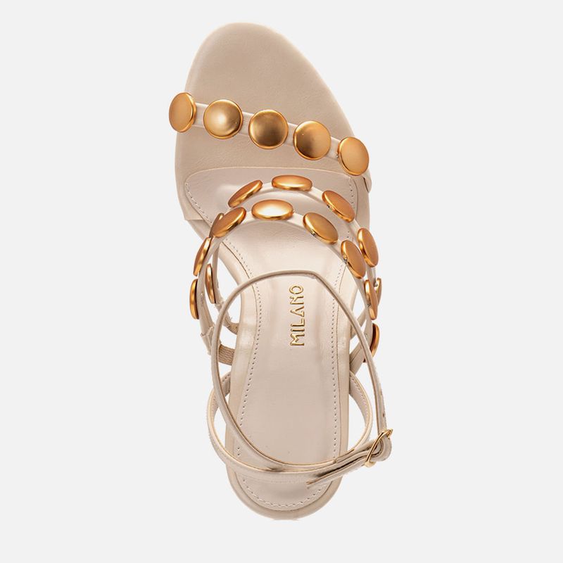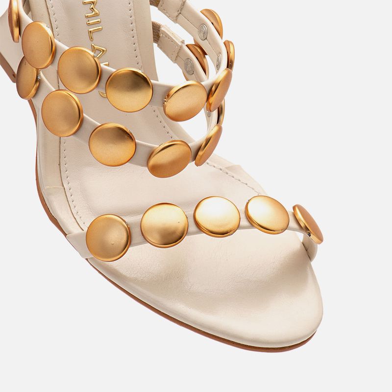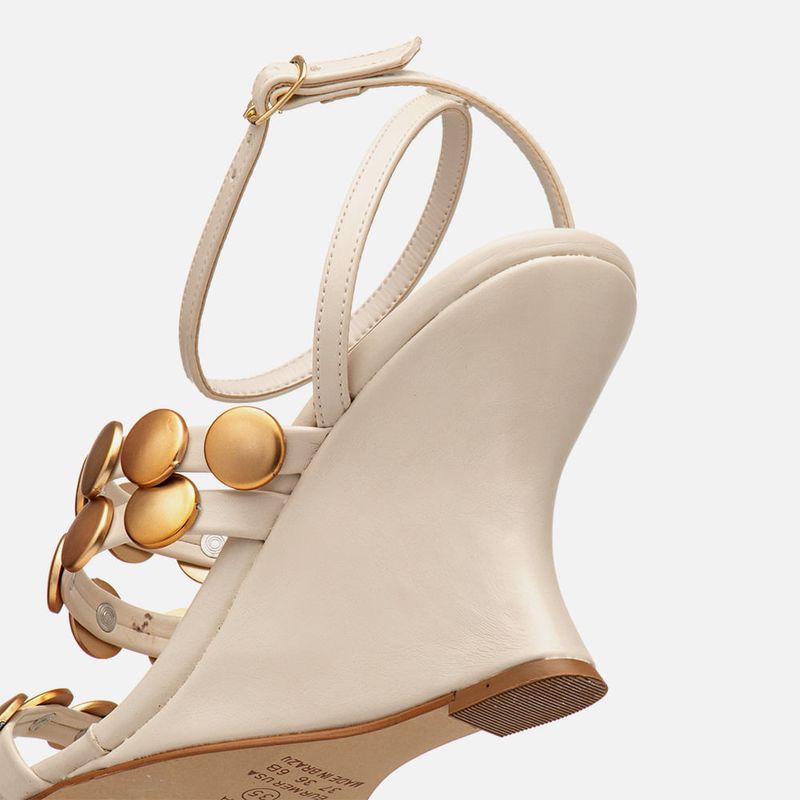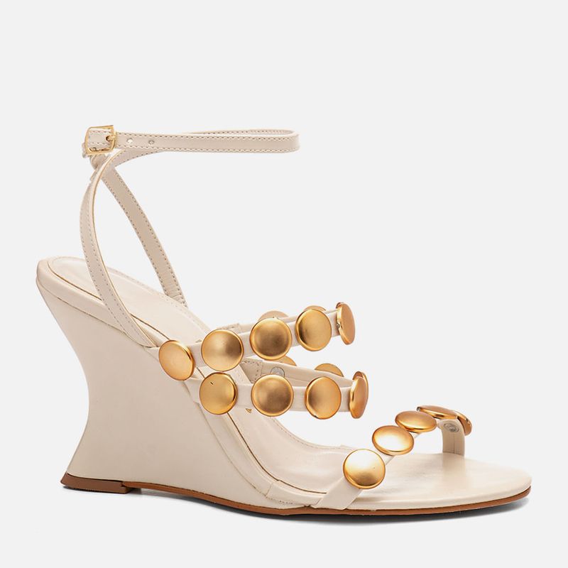 Sandália Anabela Aberta com Salto Geométrico tipo Wedge Lapidado e Sinuoso com Aplicações em Tachas Metais Dourados Medalha na cor Off white. Com solado emborrachado no mesmo tom do produto, salto anabela lapidado com formato geométrico tipo wedge, ou em formato sinuoso de onda, cabedal e salto revestido em napa, palmilha com traseira e bico arredondada, tiras achatadas com aplicação de tachas, ou studs, tipo metal, com formato medalha grande, na cor dourado fosco, sendo as tiras: uma sobre os dedos, duas no peito do pé com elástico na parte interna para melhor sustentação e duas tiras mais finas saindo das laterais do tornozelo e cruzadas em X no calcanhar com fechamento em fivela para ajuste e regulagem do calce. A palmilha tem aplique macio no mesmo tom do produto com detalhe em contorno em costura pesponto com a marca Milano em etiqueta 3D na cor dourada.