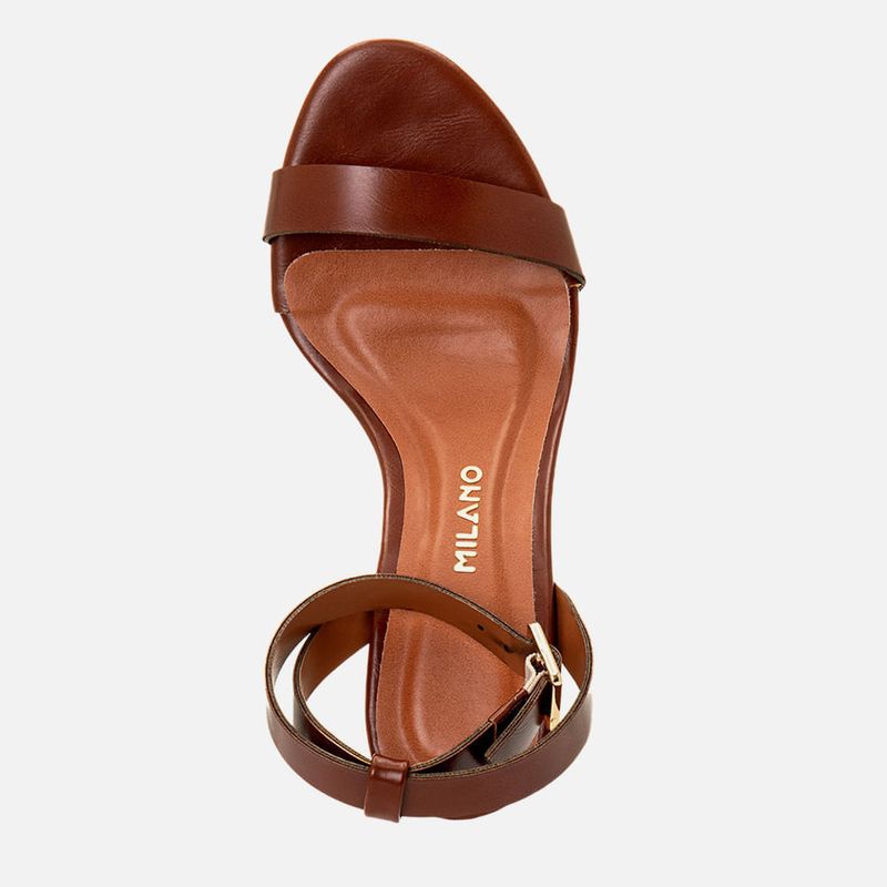 Sandália Anabela Duas Tiras Salto Escultural Wedge Fechada na cor Caramelo. Com solado emborrachado na cor caramelo com salto destacado, salto alto tipo anabela com formato escultural (wedge), palmilha com traseira e bico arredondados, tira média sobre os dedos e duas tiras saindo das laterais do tornozelo e cruzadas em X na traseira e na parte frontal com fechamento por maxi fivela quadrada, permitindo o ajuste e regulagem do calce. A palmilha tem aplique macio na cor nude com a marca Milano em etiqueta dourada.