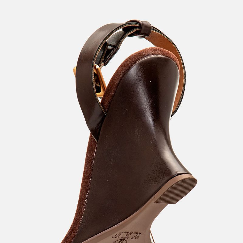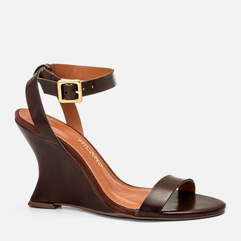 Sandália Anabela Duas Tiras Salto Escultural Wedge Fechada na cor Marrom. Com solado emborrachado na cor caramelo com salto destacado, salto alto tipo anabela com formato escultural (wedge), palmilha com traseira e bico arredondados, tira média sobre os dedos e duas tiras saindo das laterais do tornozelo e cruzadas em X na traseira e na parte frontal com fechamento por maxi fivela quadrada, permitindo o ajuste e regulagem do calce. A palmilha tem aplique macio na cor nude com a marca Milano em etiqueta dourada.