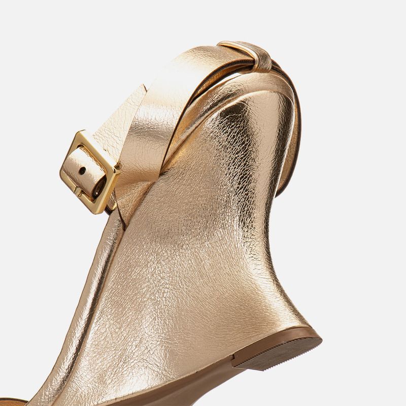 Sandália Anabela Duas Tiras Salto Escultural Wedge Fechada na cor Ouro. Com solado emborrachado na cor caramelo com salto destacado, salto alto tipo anabela com formato escultural (wedge), palmilha com traseira e bico arredondados, tira média sobre os dedos e duas tiras saindo das laterais do tornozelo e cruzadas em X na traseira e na parte frontal com fechamento por maxi fivela quadrada, permitindo o ajuste e regulagem do calce. A palmilha tem aplique macio na cor nude com a marca Milano em etiqueta dourada.