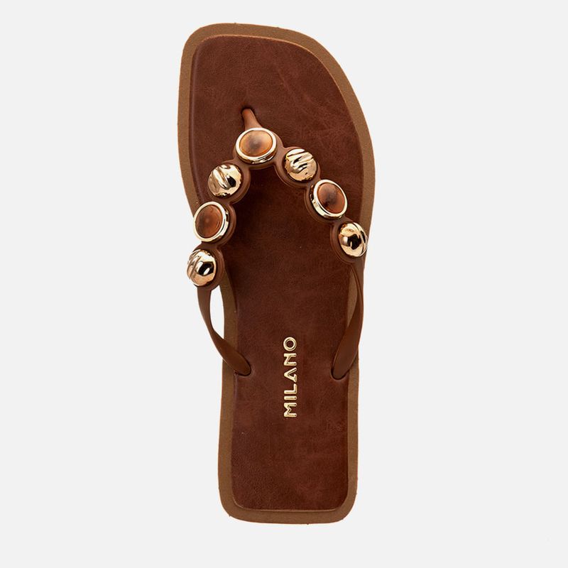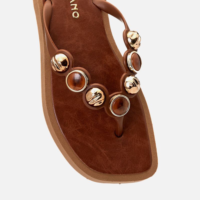 Sandália tipo Chinelo de Dedo Aberta com Aplique em Mix de Peça Metalizada com Pedraria em Resina e Peça com Formato Orgânico, com Palmilha Quadrada Emborrachada Macia na cor Terracota com Pedraria Ambar. Com palmilha emborrachada macio, com aplique na parte superior em napa caramelo, tira emborrachada em peça única tipo chinelo dividindo os dedos e cruzada nas laterais – essa tira possui formato que acompanha o desenho das pedrarias que são em mix de peça metalizada com formato orgânico e base metalizada tipo moeda com pedraria em resina aplicada no centro. A palmilha tem a marca Milano aplicada em etiqueta 3D na cor dourada.