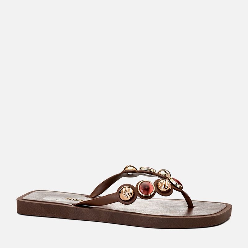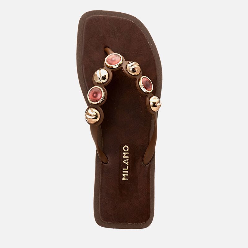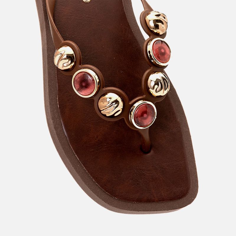 Sandália tipo Chinelo de Dedo Aberta com Aplique em Mix de Peça Metalizada com Pedraria em Resina e Peça com Formato Orgânico, com Palmilha Quadrada Emborrachada Macia na cor Vermelho com Pedraria Ambar. Com palmilha emborrachada macio, com aplique na parte superior em napa caramelo, tira emborrachada em peça única tipo chinelo dividindo os dedos e cruzada nas laterais – essa tira possui formato que acompanha o desenho das pedrarias que são em mix de peça metalizada com formato orgânico e base metalizada tipo moeda com pedraria em resina aplicada no centro. A palmilha tem a marca Milano aplicada em etiqueta 3D na cor dourada.