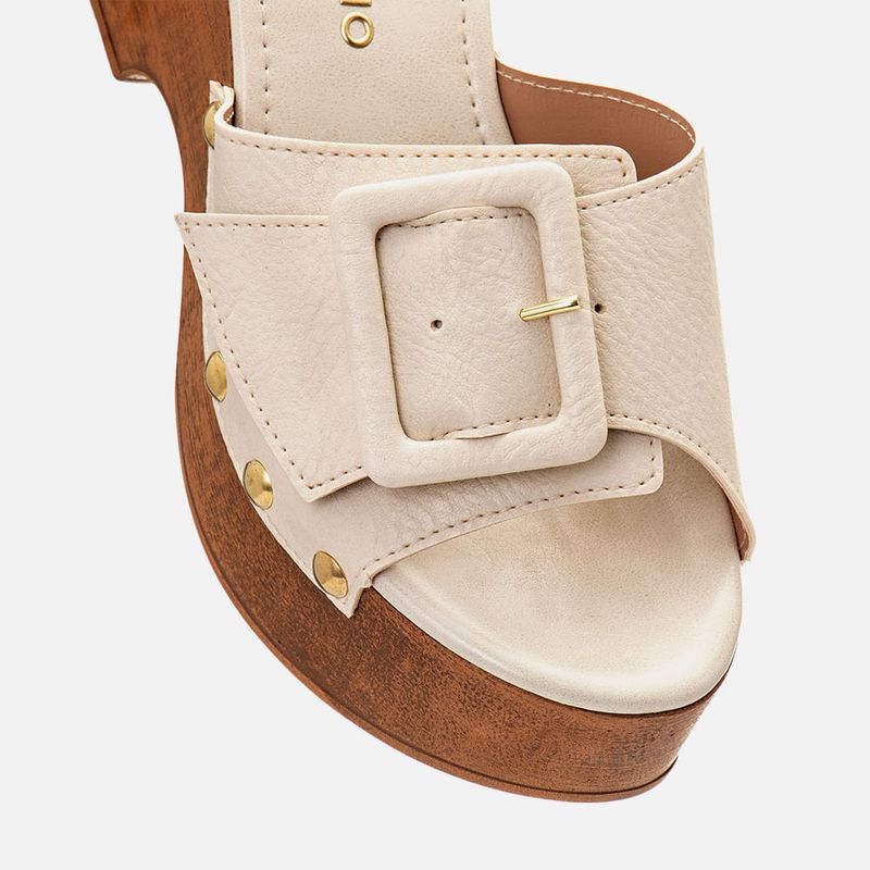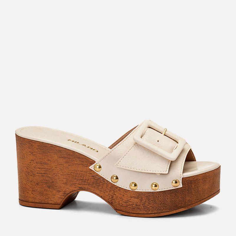 Sandália Clog Plataforma Leve tipo Tamanco com Salto Bloco Alto Textura Madeira e Tira Larga com Maxi Fivela e Tachas na cor Off White. Com sola plataforma tipo bloco alta anabelada em peça única com textura tipo madeira e super leve, apesar da aparência pesada, a base tem um recorte separando salto e meia pata com formato ondulado, a palmilha é revestida em napa com traseira e bico, tira larga tipo slide sobre os dedos e peito do pé dividida em duas peças e unidas centralmente em uma maxi fivela que também é detalhe, esta também é revestida no mesmo material do produto, possui ainda detalhe em aplicação de tachas em metal na cor dourada fazendo o acabamento da tira com o solado. A palmilha é macia e tem a marca Milano aplicada em etiqueta 3D na cor dourada.