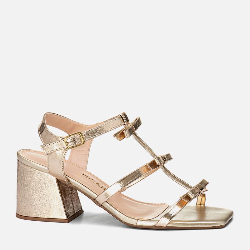 Sandália com Salto Bloco Médio Trapézio Bico Quadrado e Tiras Finas com Aplicações Boho em Lacinhos e tom Metalizado na cor Champagne. Com solado emborrachado na cor caramelo, salto bloco médio em formato geométrico trapézio – mais largo na base e palmilha com traseira arredondada e bico quadrado, ambos revestidos em napa metalizada, tiras finas achatadas cruzadas sobre os dedos, peito do pé e base do tornzozelo unidas por tira central que cruza todo o pé – ambas com aplicação de detalhe em lacinho feito por tira do mesmo material da sandália em cada ponto de união entre as tiras, o fechamento é feito por tira média achatada saindo das laterais do tornozelo e transpassada no calcanhar e na tira central do peito do pé através de fivela para regulagem e ajuste do calce. A palmilha tem aplique macio em tom nude com detalhe em contorno em costura pesponto e a marca Milano aplicada em etiqueta 3D na cor dourada.
