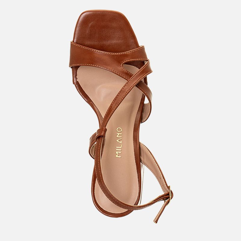Sandália de Salto Alto Bloco Flare Bico Quadrado e Tiras com Recorte Cut Out Estilo Boho na cor Caramelo. Com solado emborrachado no mesmo tom do produto sob o salto e parte frontal da palmilha, salto alto com formato bloco flare (mais largo na base), palmilha encaixada com traseira arredondada e bico quadrado, ambos revestidos em napa, tira sobre os dedos média com recorte dividindo em duas e deixando a pele à mostra na parte externa, uma tira que sai da lateral dos dedos (entre o recorte da primeira tira) e cruza no tornozelo pela parte interna do pé voltando pela lateral externa, esta tira é sustentada por outra tira na parte interna do pé e possui fivela para ajuste e regulagem do calce na parte externa. A palmilha tem aplique macio na cor nude com a marca Milano em etiqueta 3D na cor dourada.