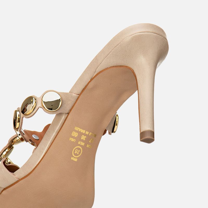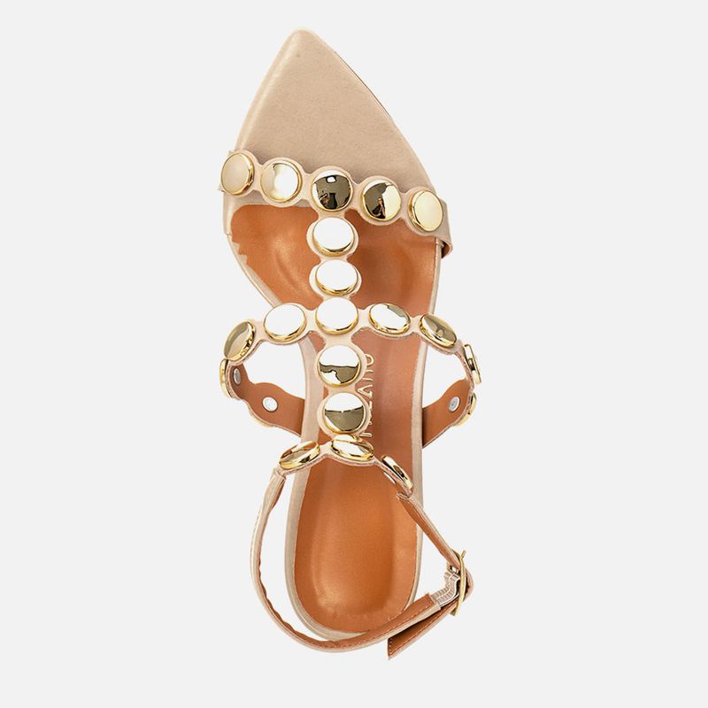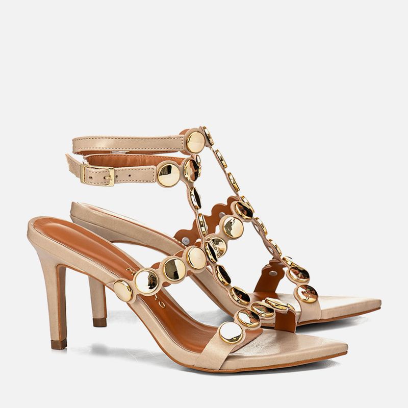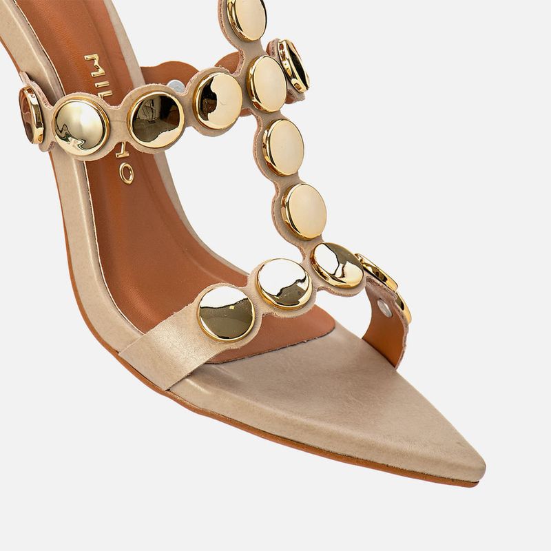 Sandália de Salto Alto Fino Bico Folha Tiras com Recorte à Laser Cruzadas no Pé e Aplicação de Metais Estilo Boho tipo Medalhas Douradas na cor Off White. Com salto alto fino, revestido no mesmo material do produto, palmilha com solado emborrachado na cor caramelo, com traseira arredondada e bico fino tipo folha, cabedal composto de peça feita com recorte à laser acompanhando o formato das aplicações de tachas estilo boho – feitas em metal tipo medalha na cor dourada, sendo a tira sobre os dedos e peito do pé e unida por uma tira central até o tornozelo, onde é fixada em uma tira achatada para fechamento e ajuste de regulagem do calce. A palmilha tem aplique macio na cor nude com a marca Milano aplicada em etiqueta 3D na cor dourada.