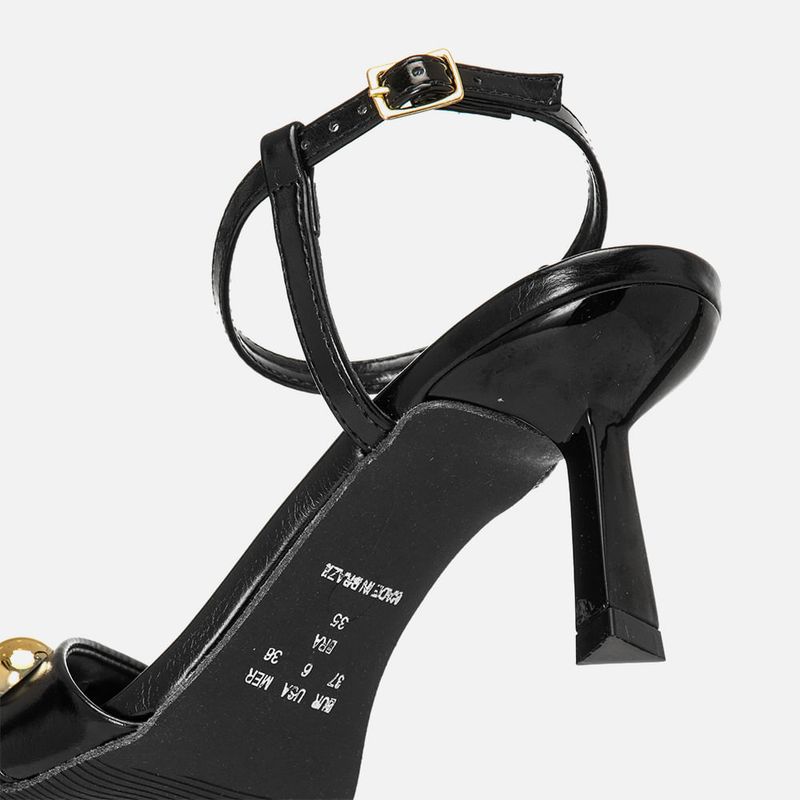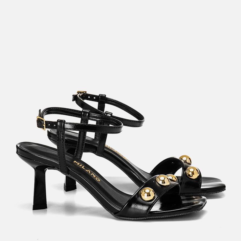 Sandália de Salto Alto tipo Taça com Bico Quadrado e Tiras com Aplicação de Tachas tipo Metal com Formato Meia Esfera Metalizada Dourada na cor Preto. Com solado emborrachado no mesmo tom do produto, sendo no taco do salto e na parte frontal da palmilha com ranhuras para maior conforto e segurança ao caminhar, Palmilha com traseira arredondada e bico quadrado revestidas em napa, tira média sobre os dedos com formato achatado e aplicação de pedrarias, ou tachas, metalizadas na cor dourada cromado e formato de meia esfera, tira fina achatada saindo da lateral do tornozelo e cruzada em outra tira fina no calcanhar com fechamento por fivela, para ajuste e regulagem do calce. A palmilha tem aplique macio na cor nude com a marca Milano em etiqueta 3D na cor dourada.