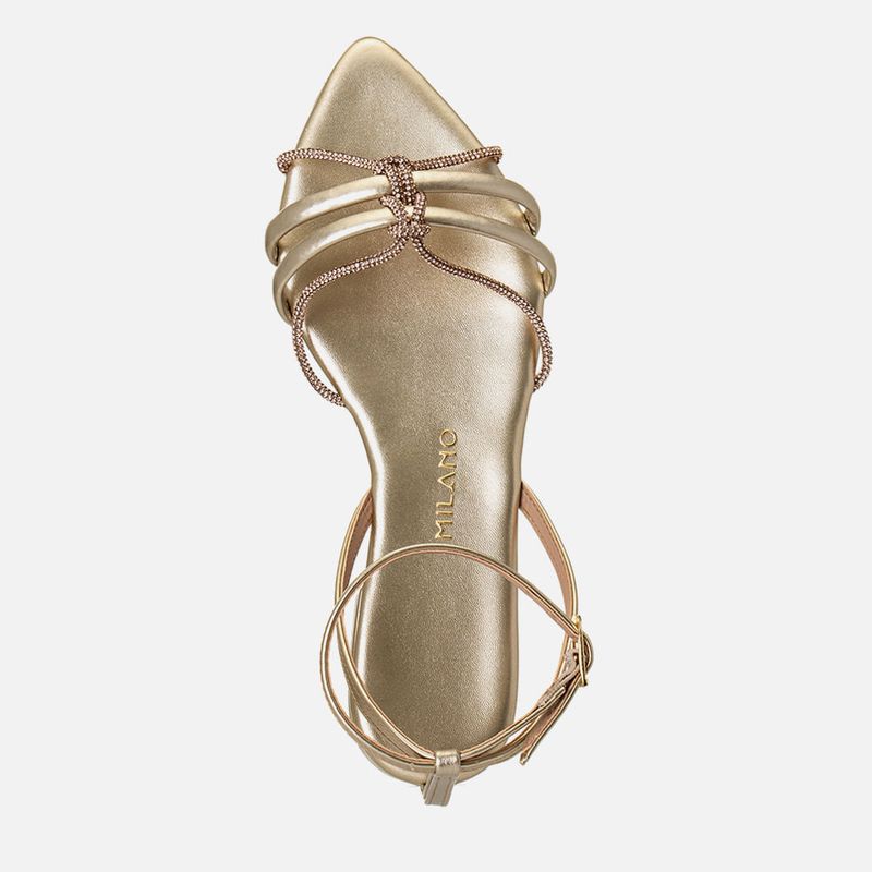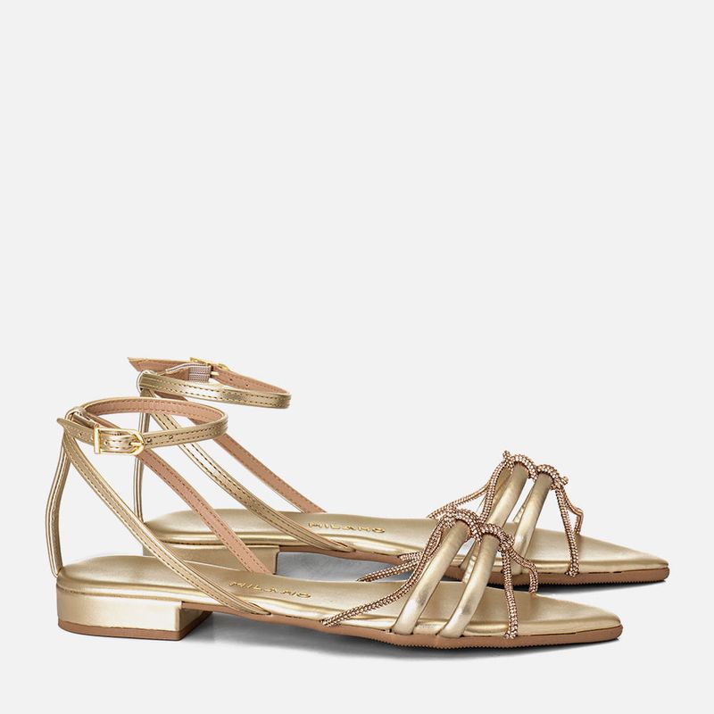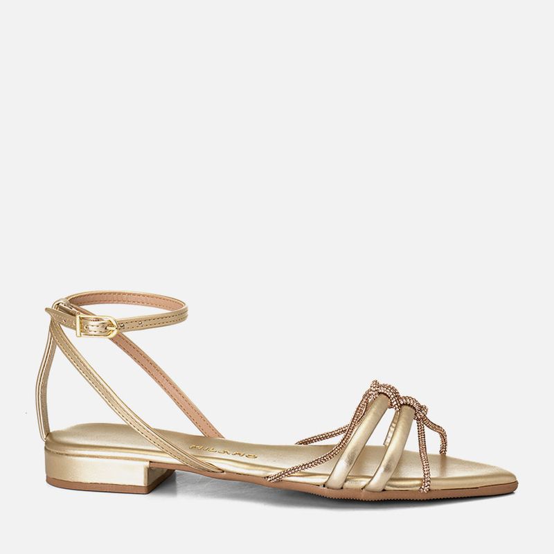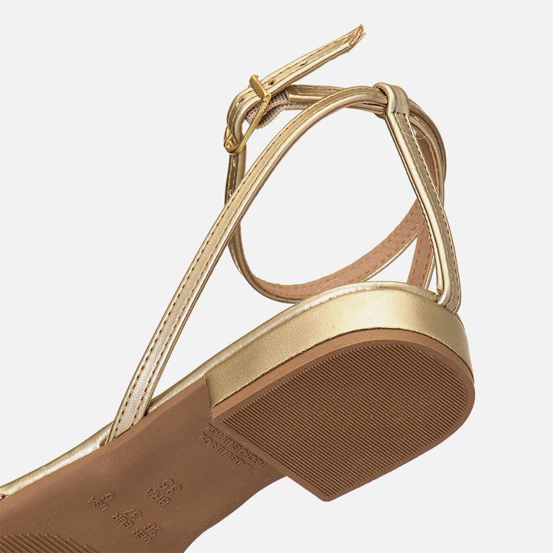 Sandália de Salto Baixo Bloco Fechada com Bico Fino Folha e Tiras em Mix de Cordão de Strass com Brilho e Estruturadas Cruzadas na cor Ouro. Com solado emborrachado na cor caramelo, salto baixo tipo bloco e palmilha revestida em napa, o modelo tem traseira arredondada e bico fino tipo folha, grupo de tiras sobre os dedos e peito do pé sendo: duas tiras em cordão de manta de strass com brilho no mesmo tom do produto e duas tiras centrais estruturadas revestidas no mesmo material do sapato, as tiras em cordão são cruzadas em tramado de nozinhos fazendo um detalhe no produto, das laterais do tornozelo saem duas tiras finas achatadas que são cruzadas no calcanhar e depois no tornozelo sustentadas por uma tira traseira com passador para estas, o fechamento é feito por fivela para regulagem e ajuste do calce. A palmilha tem a marca Milano aplicada em etiqueta 3D na cor dourada.