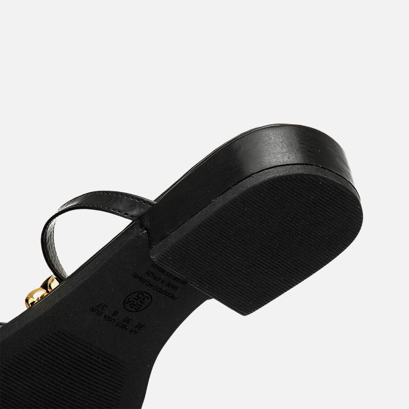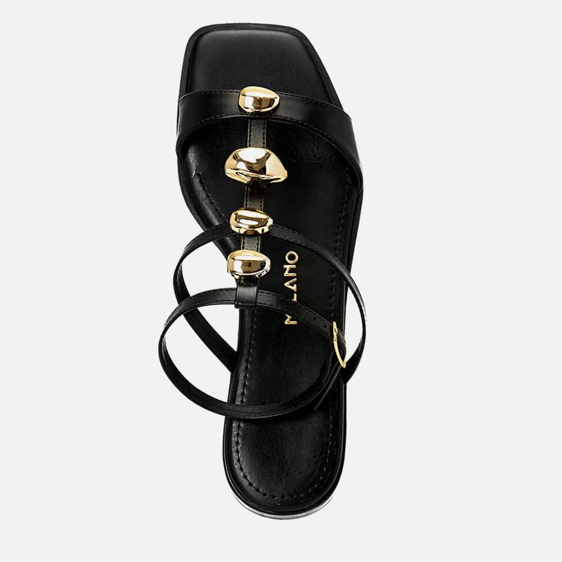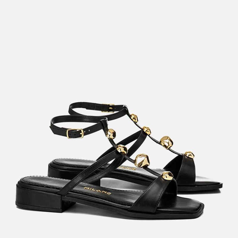 Sandália de Salto Bloco Baixo com Tiras Cruzadas com Aplicação de Peça Orgânica Metalizada em Multiformatos e Tamanhos Estilo Boho na cor Preto. Com solado emborrachado na cor caramelo sendo no salto e na parte frontal do cabedal com formato oversize tipo vira aparente, salto bloco baixo e palmilha revestida em napa rústica, traseira arredondada e bico quadrado, tira média com recorte arredondado sobre os dedos, tira achatada fina na base do tornozelo e uma outra tira unindo todas e cruzada no peito do pé até o tornozelo com passante para a tira fina achatada para fechamento no tornozelo com ajuste e regulagem do calce por fivela, a tira central tem aplicação de peças com formato orgânico metalizadas em dois tamanhos e multiformatos no estilo boho. A palmilha tem aplique no mesmo material da sandália com detalhe em costura acompanhando o formato e a marca Milano aplicada em etiqueta 3D na cor dourada.