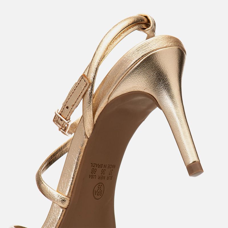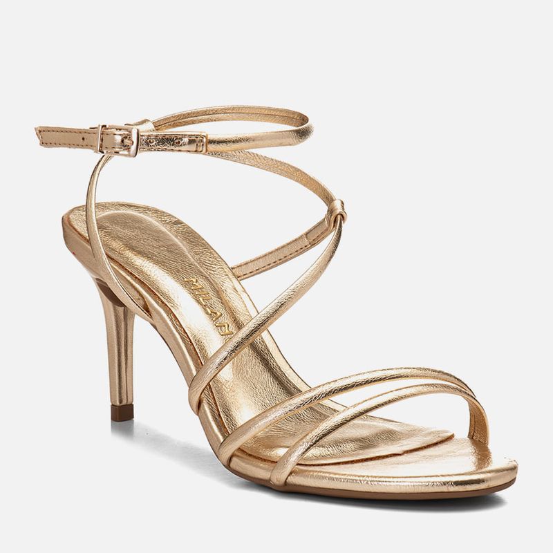 Sandália Salto Alto Fino Metalizada Texturizada Festa com Tiras Estruturadas Cruzadas e Bico Arredondado na cor Ouro Light. Com solado emborrachado na cor caramelo sob o salto e parte frontal da palmilha – que tem traseira e bico arredondados, cabedal totalmente revestido em material metalizado, tiras finas e estruturadas cruzadas desenhando a silhueta, sendo duas sobre os dedos – uma reta e outra abrindo na diagonal externa, uma tira saindo da lateral externa do peito do pé e cruzada no tornozelo e depois unida a outra tira que sai do tornozelo fazendo o fechamento por fivela, que permite o ajuste e regulagem do calce. A palmilha tem aplique macio no mesmo tom do produto com a marca Milano aplicada em etiqueta 3D na cor dourada.