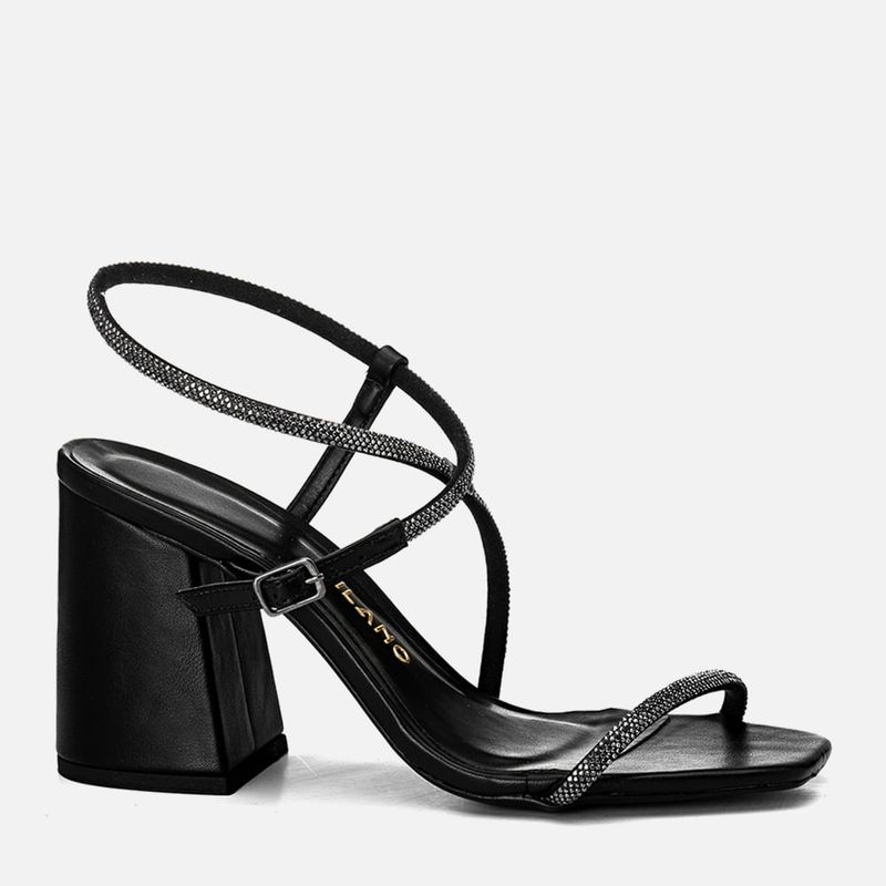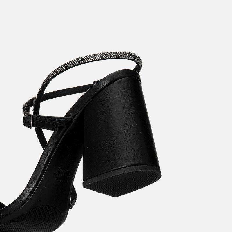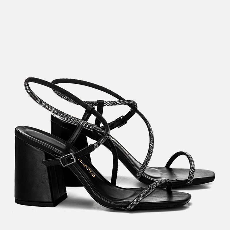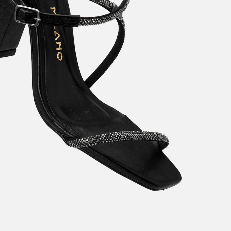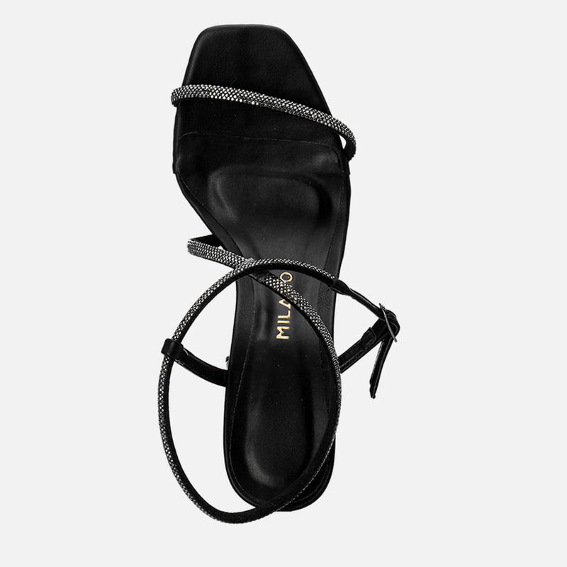 Sandália com Salto Alto Bloco tipo Trapézio Tiras Estruturadas com Aplicação de Brilho em Manta de Strass Cruzadas pelo Pé na cor Preto. Com salto alto bloco tipo trapézio – com a face interna inclinada e traseira arredondada, revestido em napa, palmilha com traseira arredondada e bico quadrado mais fino, grupo de tiras finas estruturadas com aplicação de brilho em manta de strass no mesmo tom do produto sendo uma sobre os dedos e uma saindo da lateral interna do peito do pé e cruzada centralmente no peito do pé e tornozelo desenhando a silhueta, esta tira é fixada por uma tira em napa achatada na parte interna na lateral do tornozelo. O fechamento é feita por uma tira na ponta da parte com brilho com um aplique de tira achatada com ajuste e regulagem do calce por fivela. A palmilha tem aplique macio no mesmo tom do produto com a marca Milano aplicada em etiqueta 3D na cor dourada.