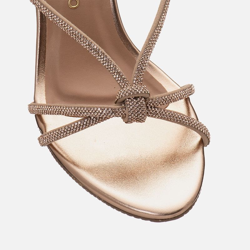 Sandália de Festa Salto Alto Fino tipo Taça Triangular Metalizada com Bico Folha e Tiras com Aplicação de Brilho em Manta de Strass na cor Cobre. Com solado emborrachado na cor caramelo, sob o salto e parte frontal do modelo, salto médio fino tipo taça com formato triangular, palmilha revestida em material metalizado com traseira arredondada e bico fino tipo folha, tiras estruturadas com aplicação de brilho em manta de strass no mesmo tom do produto sendo: duas sobre os dedos, uma em nozinho unindo essas duas tiras e subindo pelo peito do pé até cruzar no tornozelo, sustentadas por duas tiras lisas achatadas nas laterais, o fechamento é feito por fivela que permite o ajuste e regulagem do calce. A palmilha tem aplique macio no mesmo material com a marca Milano em etiqueta 3D na cor dourada.