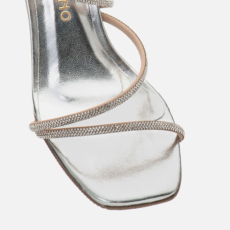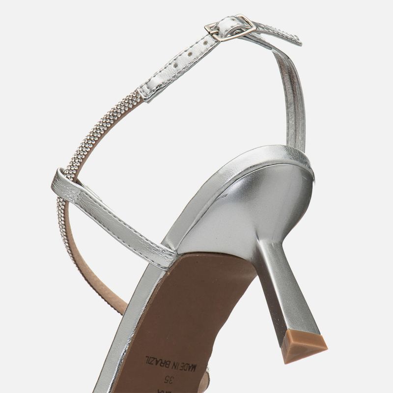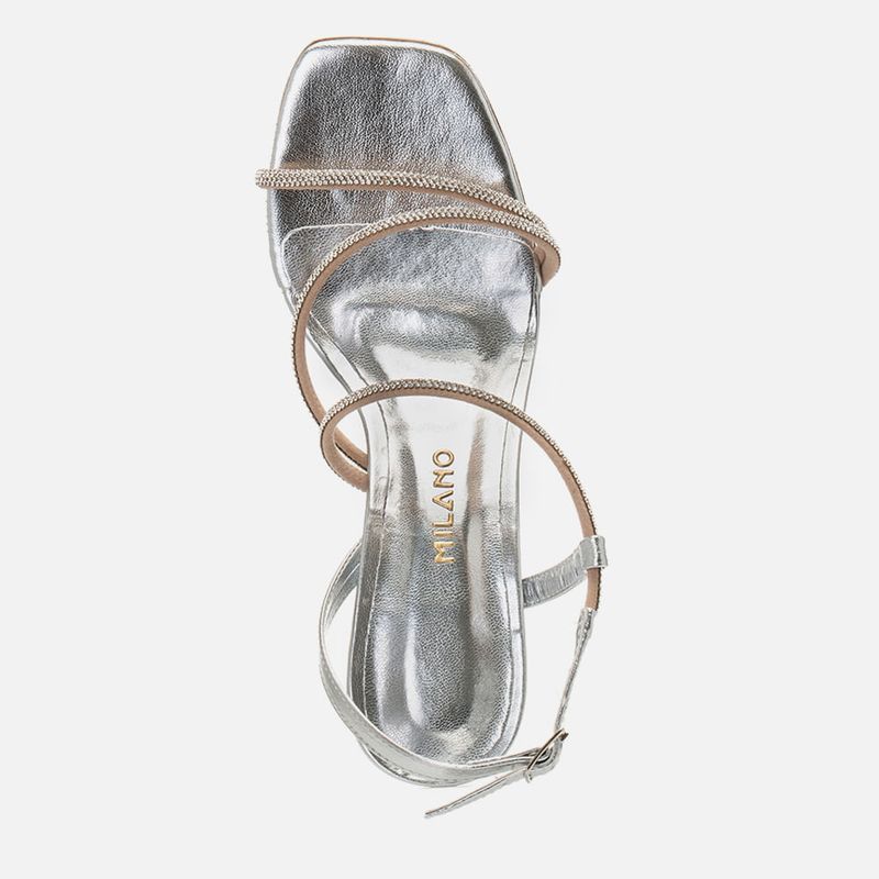 Sandália de Festa Salto Alto Fino tipo Taça Triangular Metalizada com Bico Quadrado e Tiras com Aplicação de Brilho em Manta de Strass na cor Prata. Com solado emborrachado na cor caramelo, sob o salto e parte frontal do modelo, salto médio fino tipo taça com formato triangular, palmilha revestida em material metalizado com traseira arredondada e bico quadrado, tiras estruturadas com aplicação de brilho em manta de strass no mesmo tom do produto sendo: uma sobre os dedos, uma em saindo da lateral externa dos dedos e cruzada no peito do pé e uma última saindo da lateral interna e cruzada no tornozelo sustentada por uma tira achatada no mesmo material do modelo, o fechamento é feito por fivela que permite o ajuste e regulagem do calce. A palmilha tem aplique macio no mesmo material com a marca Milano em etiqueta 3D na cor dourada.