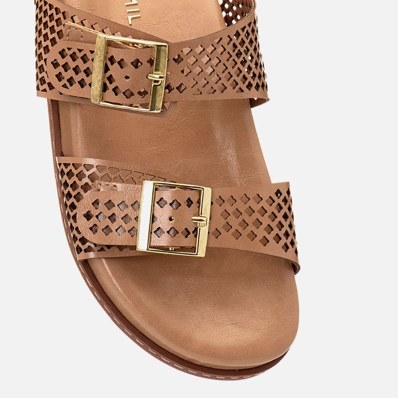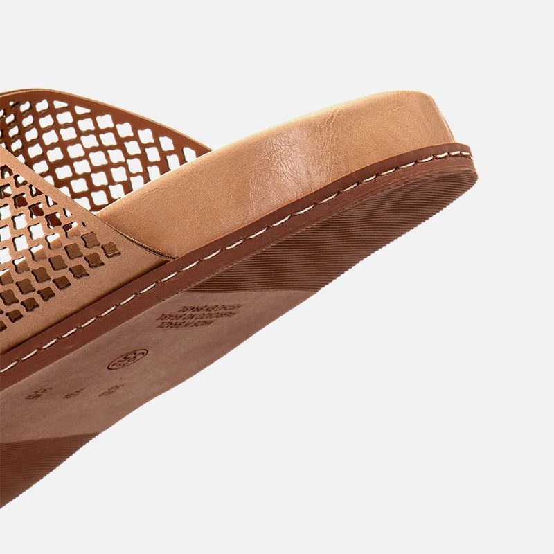 Sandália Papete Aberta Tiras Cruzadas com Recorte à Laser e Palmilha Conforto Anatômica na cor Bege. Com solado emborrachado na cor caramelo com altura média e formato oversize com vira aparente com detalhe em costura decorativa na lateral, palmilha com formato anatômico para maior conforto com traseira e bico arredondados, as tiras cruzadas são médias achatadas sendo: uma sobre os dedos e outra sobre a base do tornozelo, elas são duplas com recorte à laser em padrão losangular e tem fechamento por fivela em metal na cor dourada, ambas as tiras tem ajuste para maior conforto do calce. O modelo é aberto na traseira de calce prático, a palmilha tem a marca Milano aplicada em etiqueta 3D na cor dourada.