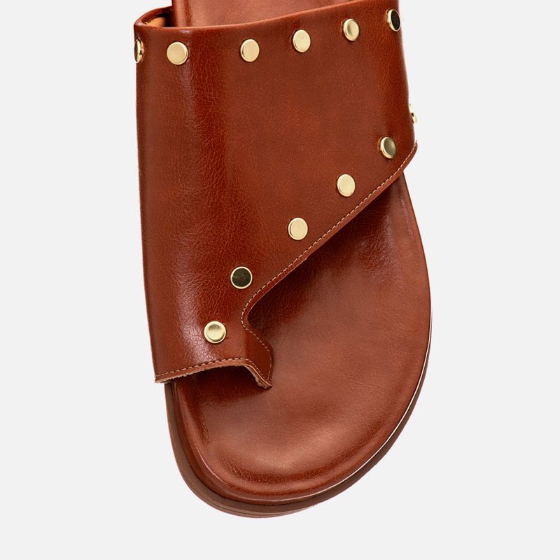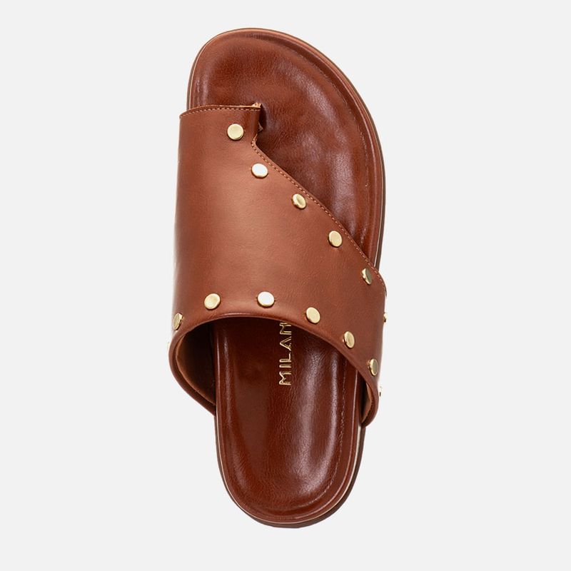 Sandália Papete com Palmilha Anatômica e Tira Larga com Ring Toe ou Anel de Dedo e Aplicação de Brilho em Tachas Rebite Dourado na cor Caramelo. Com solado emborrachado na cor caramelo com vira oversize aparente, palmilha macia encaixada com altura média e formato anatômico, revestida em napa lisa com traseira e bico arredondados, tira larga única com recortes irregulares dividindo o dedão tipo ring toe – ou anel de dedo ou dedeira, lateral interna do pé totalmente coberta e deixando os dedos na parte externa à mostra, essa tira tem detalhe em contorno feito em costura pesponto na parte inferior e aplicação de brilho em metal com formato de rebite médios na cor dourado – eles acompanham o formato desta tira. A palmilha tem a marca Milano aplicada em etiqueta 3D na cor dourada.