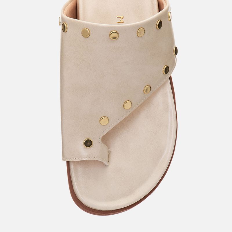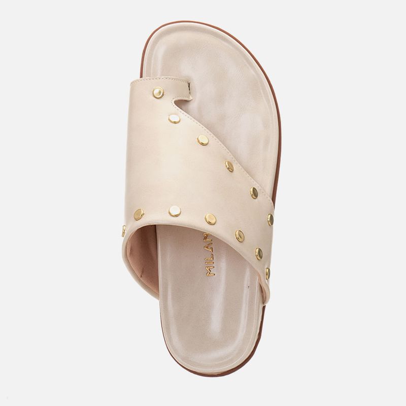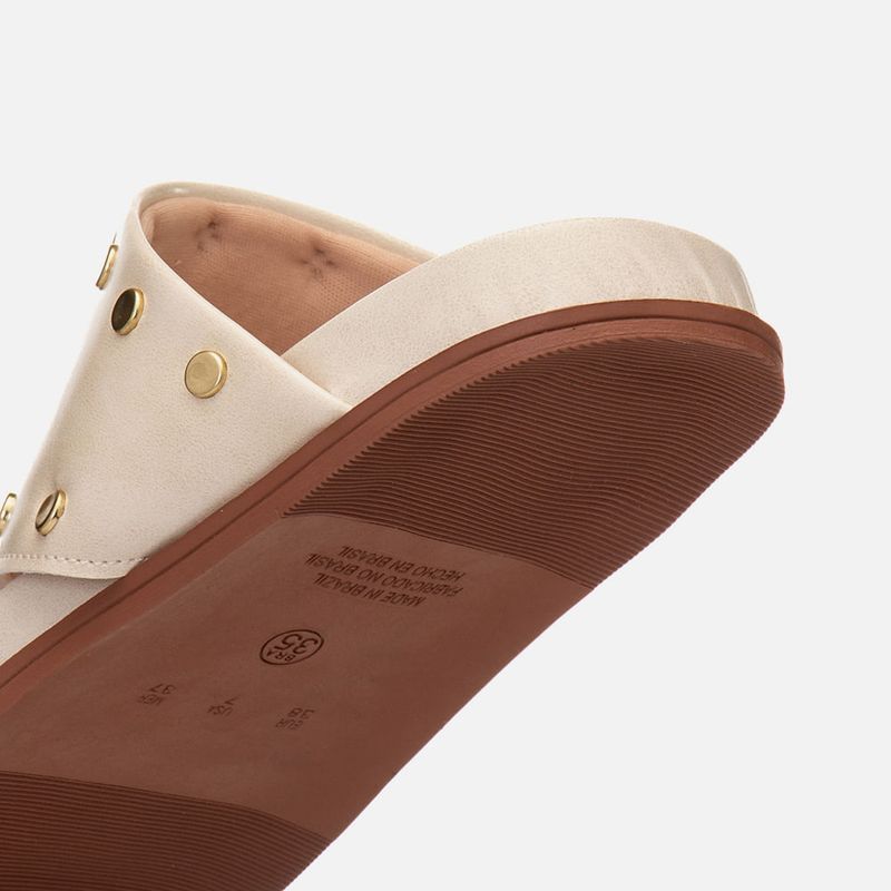 Sandália Papete com Palmilha Anatômica e Tira Larga com Ring Toe ou Anel de Dedo e Aplicação de Brilho em Tachas Rebite Dourado na cor Off White. Com solado emborrachado na cor caramelo com vira oversize aparente, palmilha macia encaixada com altura média e formato anatômico, revestida em napa lisa com traseira e bico arredondados, tira larga única com recortes irregulares dividindo o dedão tipo ring toe – ou anel de dedo ou dedeira, lateral interna do pé totalmente coberta e deixando os dedos na parte externa à mostra, essa tira tem detalhe em contorno feito em costura pesponto na parte inferior e aplicação de brilho em metal com formato de rebite médios na cor dourado – eles acompanham o formato desta tira. A palmilha tem a marca Milano aplicada em etiqueta 3D na cor dourada.