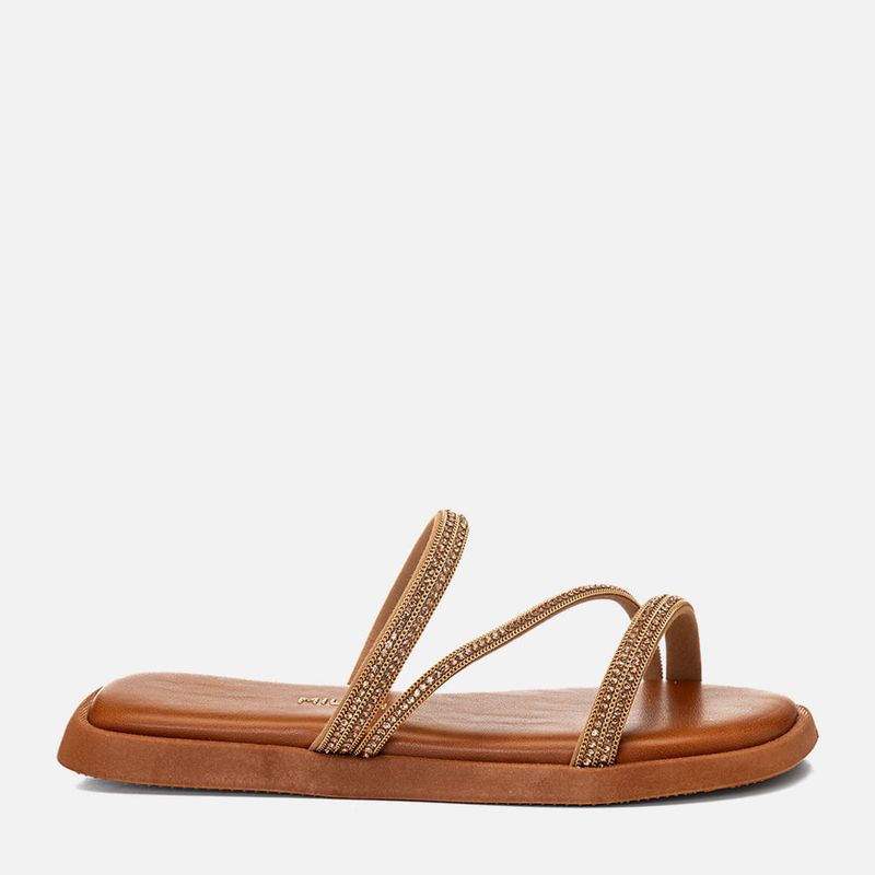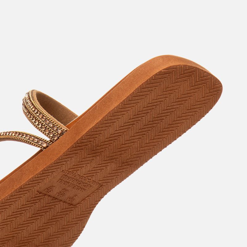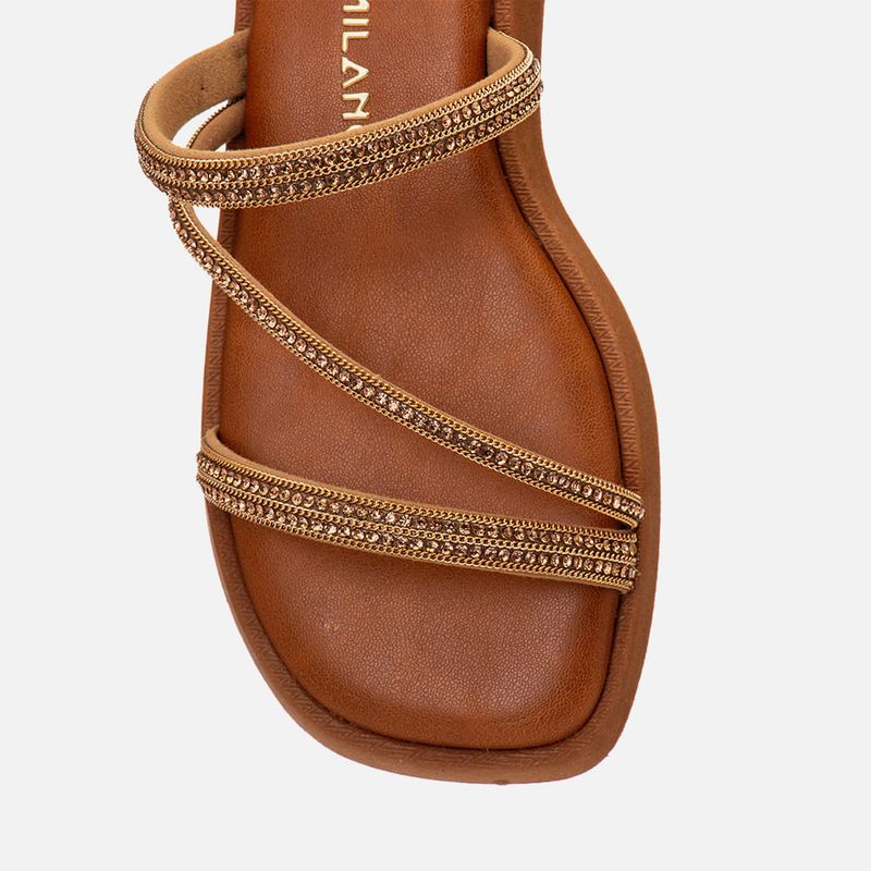 Sandália Papete com Tiras com Aplicação de Brilho em Mix de Pedrarias Strass e Corrente e Calce Prático na cor Caramelo. Com solado emborrachado com formato oversize, palmilha super macia acolchoada encaixada com traseira e bico quadrados revestida em napa na cor caramelo, grupo de tiras com aplicação de brilho em mix de pedrarias composto de micro corrente dourada e mini strass no mesmo tom do produto, sendo: uma tira média fofinha sobre os dedos, uma fina saindo da lateral interna dos dedos e cruzada em diagonal no peito do pé e outra tiras média fofinha na base do tornozelo, o modelo é de calce prático sem amarrações. A palmilha tem a marca Milano aplicada em silk na cor café.