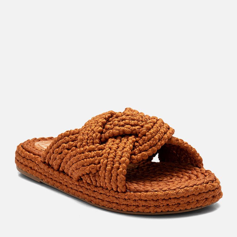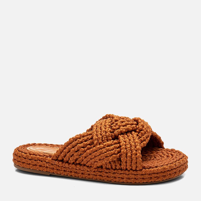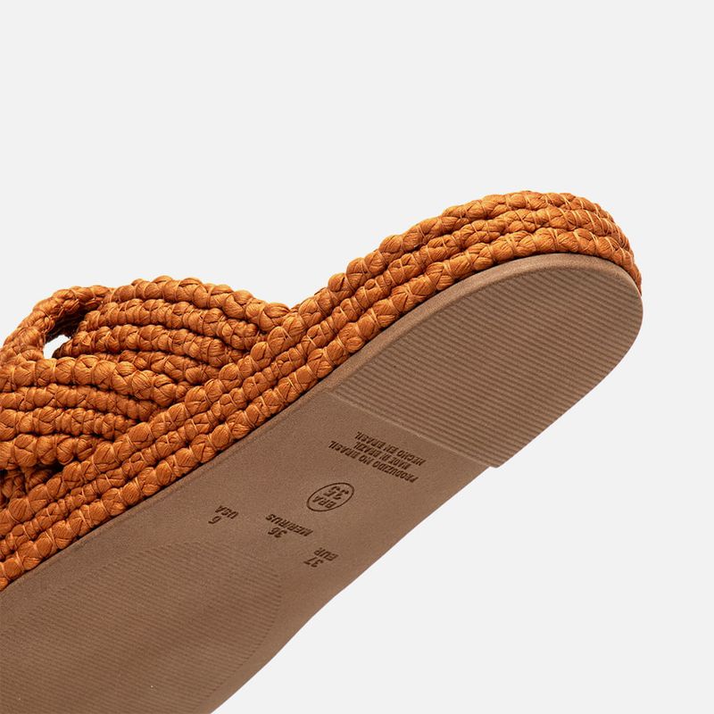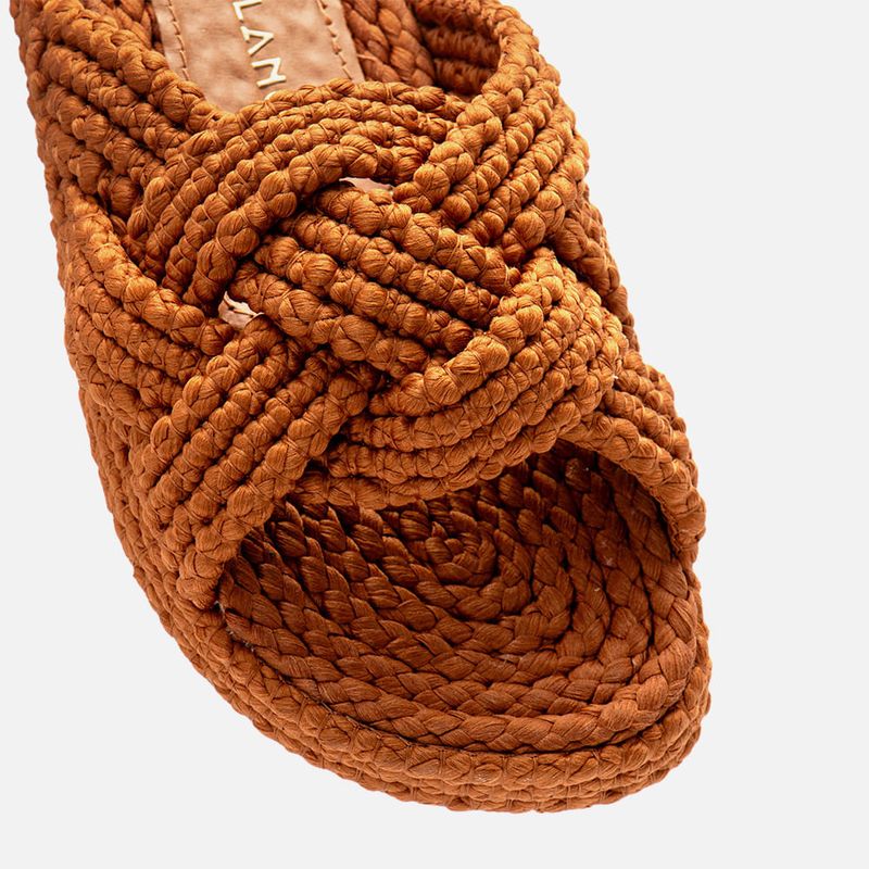 Sandália Papete Revestida em Corda e Tiras Tramadas Trançadas e Cruzadas tipo Natural na cor Caramelo. Com solado rasteiro emborrachado na cor caramelo com saltinho mínimo, palmilha arredondada flatform com altura média revestida em aplicação de cordas naturais, tanto na lateral como na parte central da palmilha, grupo de quatro tiras médias saindo da lateral do peito do pé e cruzadas na parte central formando uma grande tira tipo slide, as tiras são trançadas entre si tipo tressê e feitas da mesma corda que reveste a palmilha. A palmilha tem aplique em napa na cor nude com a marca milano aplicada em etiqueta 3d na cor dourada.