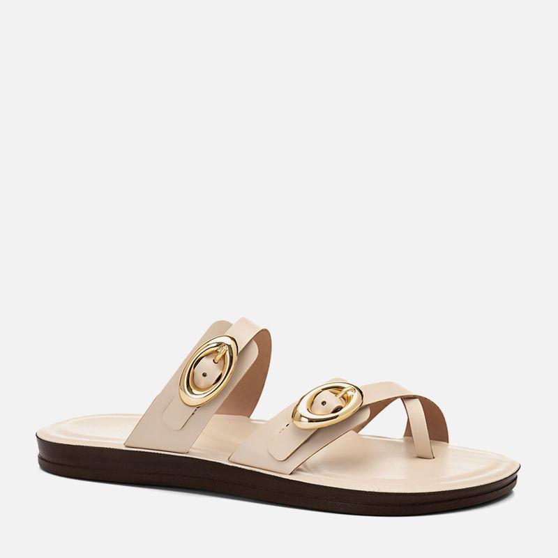 Sandália Papete de Dedo ou Ring Toe com Tiras Cruzadas e Detalhe em Maxi Fivela Dourada na cor Off White. Com solado emborrachado na cor marrom com solado médio anatômico, palmilha injetada diretamente na sola, tecnologia especial que evita descolamentos e garante maior durabilidade, esta tem ainda design conformado com detalhes em vincos acompanhando o formato do modelo e garantindo melhor calce com mais conforto, tira dupla dividindo os dedos tipo ring toe – ou anel de dedo ou dedeira, e cruzada em diagonal na lateral externa do peito do pé, outra tira dupla é cruzada na base do tornozelo, ambas possuem maxi fivela oval na cor dourada metalizada com ajuste e regulagem do calce para mair conforto do calce. A palmilha tem a marca Milano aplicada em silk na cor dourada.