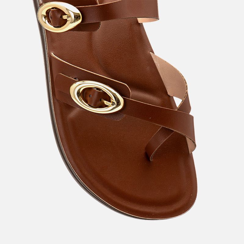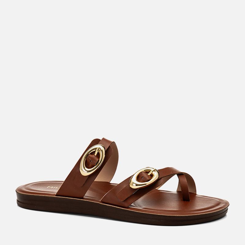 Sandália Papete de Dedo ou Ring Toe com Tiras Cruzadas e Detalhe em Maxi Fivela Dourada na cor Marrom. Com solado emborrachado na cor marrom com solado médio anatômico, palmilha injetada diretamente na sola, tecnologia especial que evita descolamentos e garante maior durabilidade, esta tem ainda design conformado com detalhes em vincos acompanhando o formato do modelo e garantindo melhor calce com mais conforto, tira dupla dividindo os dedos tipo ring toe – ou anel de dedo ou dedeira, e cruzada em diagonal na lateral externa do peito do pé, outra tira dupla é cruzada na base do tornozelo, ambas possuem maxi fivela oval na cor dourada metalizada com ajuste e regulagem do calce para mair conforto do calce. A palmilha tem a marca Milano aplicada em silk na cor dourada.