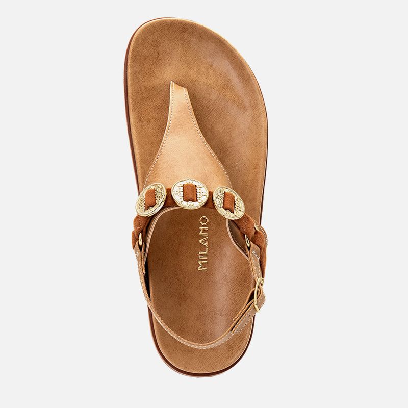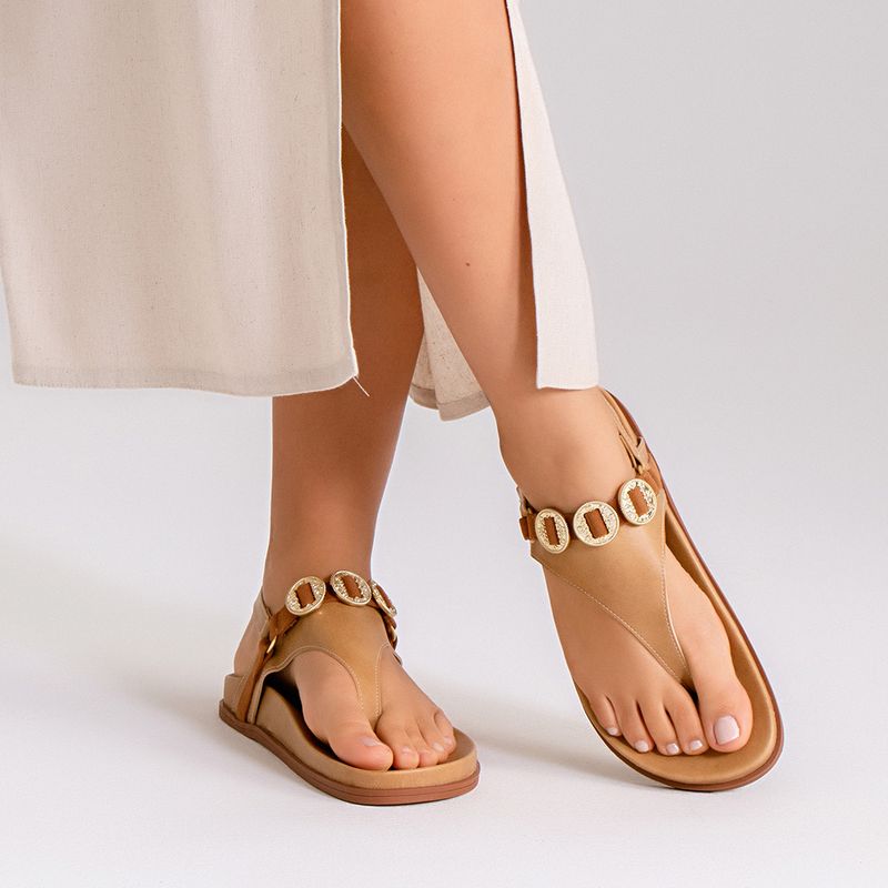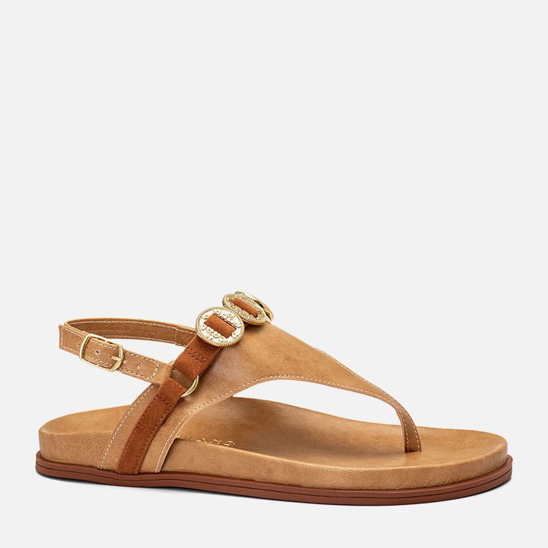 Sandália Papete com Tira Cruzada no Peito do Pé com Detalhe em Tira tipo Camurça com Aplicação de Medalhas Metalizadas Transpassadas na cor Bege. Com solado emborrachado achatado na cor caramelo, palmilha revestida em napa com formato anatômico, tira em peça única dividindo o dedão e cruzada por todo o peito do pé até as laterais do tornozelo com detalhe de tira em material aveludado tipo camurça saindo das laterais, unidos por elo em outra tira sobre a base da peça que é transpassada por 3 peças metalizadas tipo medalhas vazadas no centro, nesse elo que une as duas pelas vai a última tira achatada que é cruzada na traseira com fechamento e ajuste do calce por fivela. A palmilha tem a marca Milano aplicada em etiqueta 3D na cor dourada.