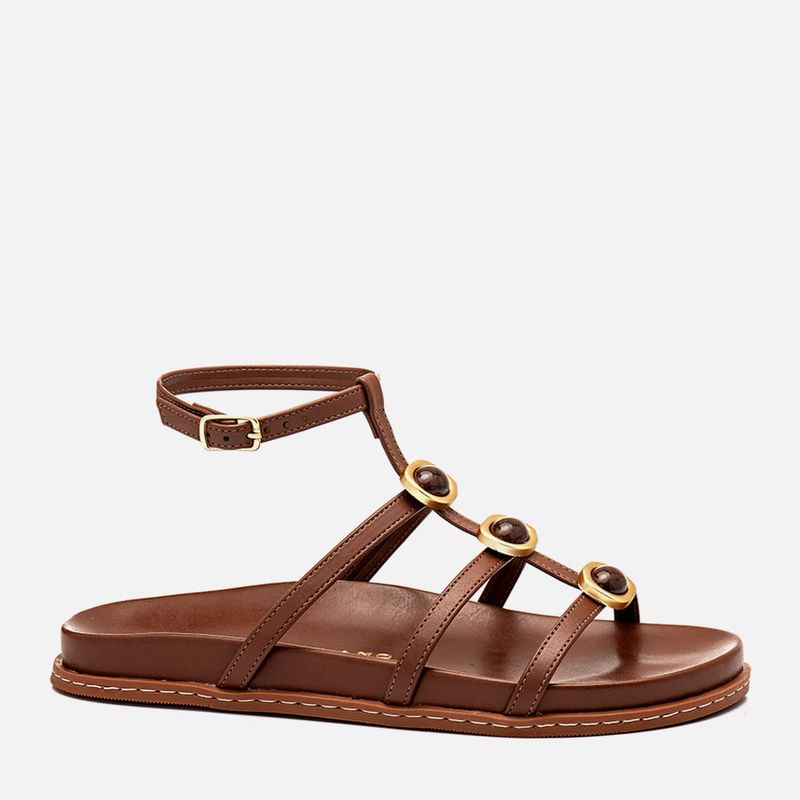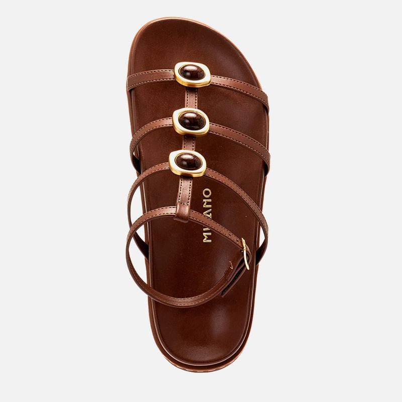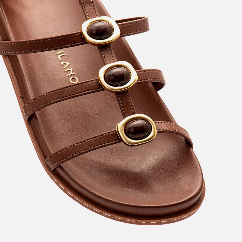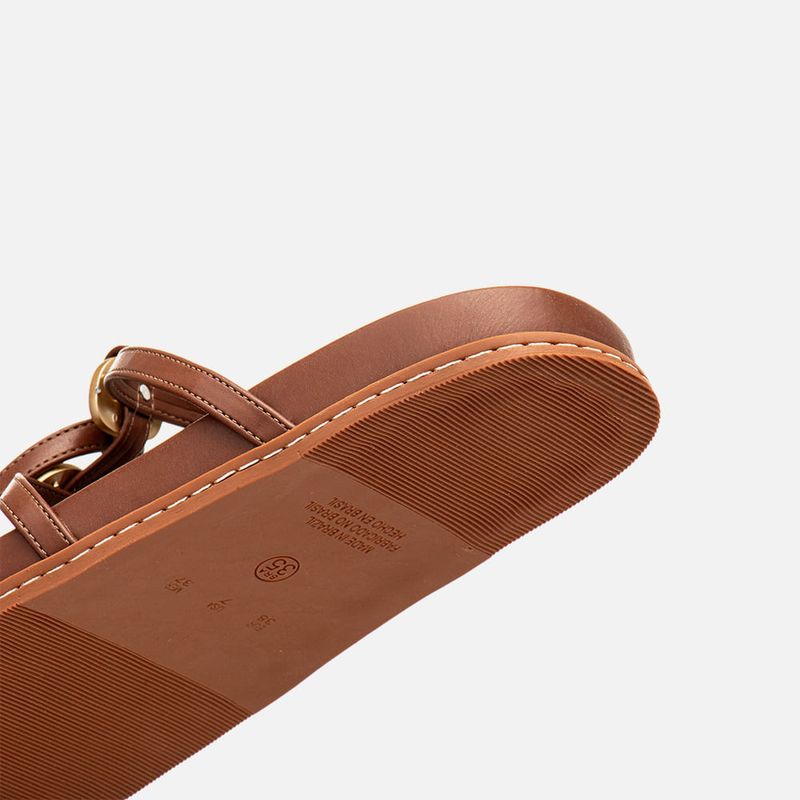 Sandália Papete Fechada Anatômica com Tiras Finas e Aplicação em Peça Metalizada com Formato Orgânico e Pedraria em Resina na cor Marrom. Com solado emborrachado na cor caramelo com costura pesponto em detalhe tipo vira aparente, palmilha com formato anatômico para maior conforto do calce, encaixada com traseira e bico arredondados, três tiras finas achatadas sobre os dedos e peito do pé, unidas por uma tira central que atravessa verticalmente o peito do com passador para a tira que cruza o tornozelo fazendo o fechamento, nessa tira central são aplicadas 3 peças metalizadas com formato orgânico na cor dourado fosco com pedraria rajada em resina no mesmo tom do produto no ponto de encontro entre as tiras, o fechamento tem ajuste e regulagem do calce por fivela. A palmilha tem a marca Milano aplicada em etiqueta 3D na cor dourada.