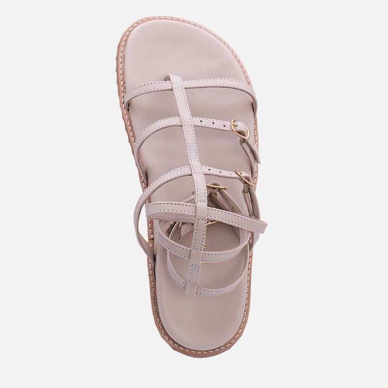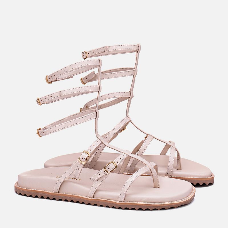 Sandália Papete tipo Gladiadora (ou Birken) de tiras finas na cor Feno. Com tiras fininhas achatadas inspiradas no estilo gladiadora, essa papete tem solado emborrachado dentado costurado ao cabedal, palmilha ultra macia com formato anatômico revestido, uma tira central dividindo os dedos e cruzada por todo o pé até o meio da canela, sendo as outras tiras fixadas nesta sobre os dedos, peito do pé e subindo pela pela, todas as tiras tem ajuste por fivela para um calce mais confortável e com mais estabilidade, exceto a primeira sobre os dedos, o modelo tem a marca aplicada na palmilha em etiqueta 3D na cor dourada.