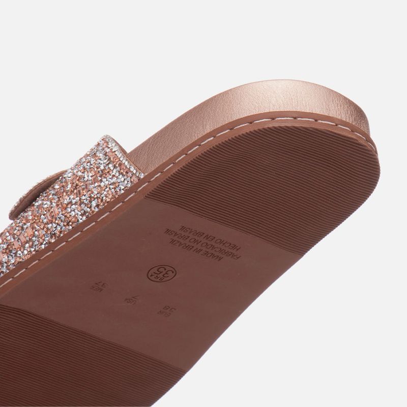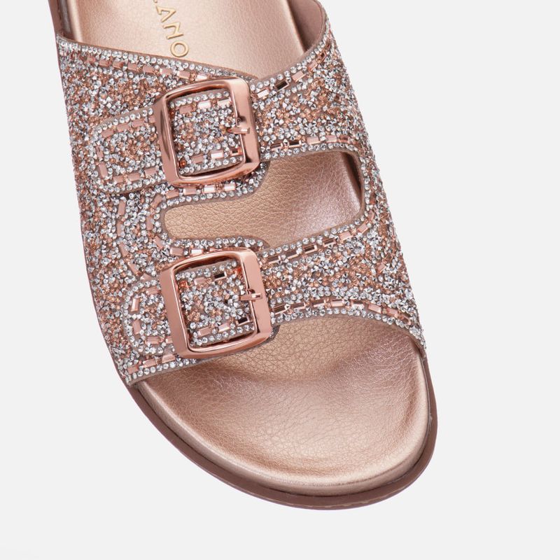 Sandália Papete Metalizada com Palmilha Anatômica e Tira Cravejada em Mix de Pedrarias e Detalhe em Fivela na cor Rosé Gold. Com solado emborrachado caramelo com detalhe em costura pesponto na lateral, palmilha encaixada arredondada com formato anatômico revestida em napa, tiras clássicas do modelo com recorte arredondado em formato de U e proeminentes, o modelo é revestido e cravejado com mix de pedrarias de vários formatos e sobretons, na peça externa ao pé estão as maxi fivelas em metal. A palmilha tem a marca Milano aplicada em etiqueta 3D na cor dourada.